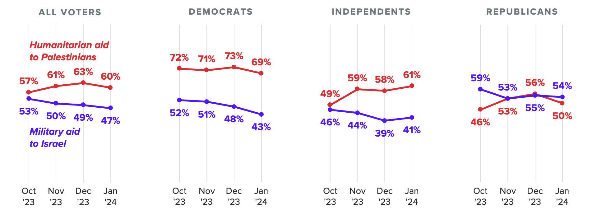 Our January survey found that 60% voters support humanitarian aid to Palestinians such as health care, food and water, shelter and other safety measures for victims, compared with 47% who said the same of military assistance to Israel after a steady decline in support since October. Democrats and independents are far more likely to back civilian relief despite some pushback from the right on Capitol Hill, as are the youngest voters — though older voters are still less likely to support military assistance.