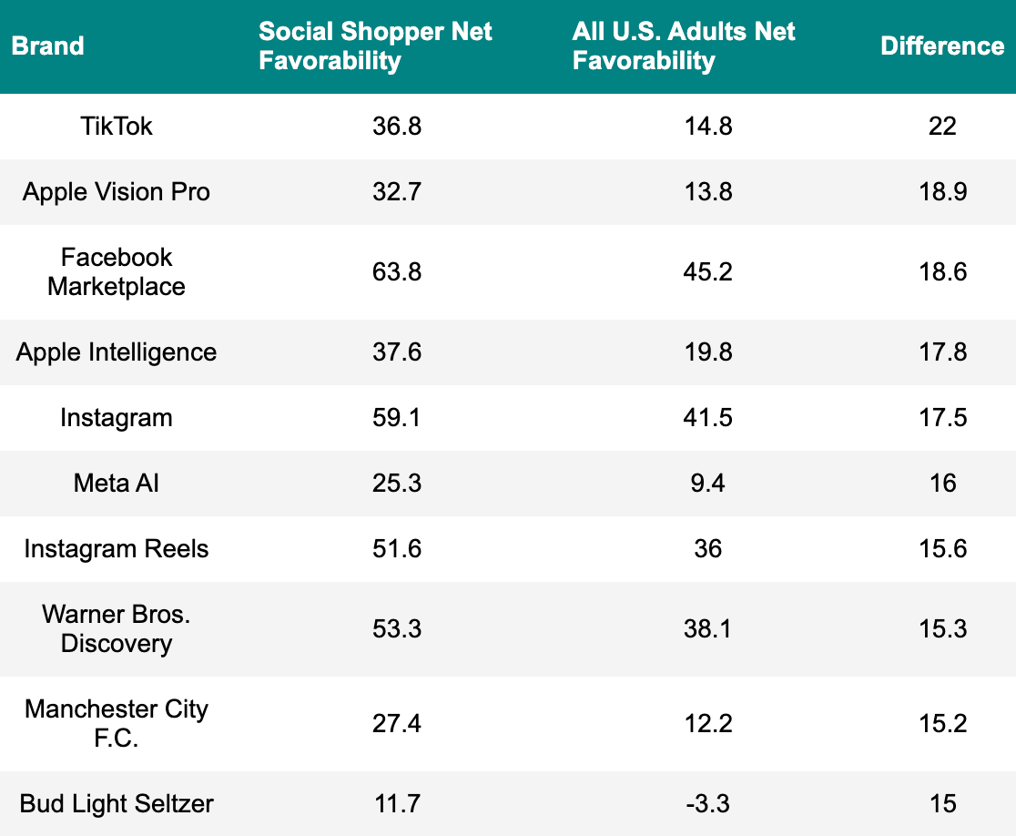 The brands that stand out from the pack for social media shoppers, or those with the largest favorability gap between social media shoppers and the general population, favor tech and social media companies. TikTok tops the list, and Apple brands like Vision Pro and Intelligence are highly ranked. Meta’s Facebook Marketplace, AI and Instagram and Reels also all made the top ten. Read more into how social media and online shopping are increasingly connected.