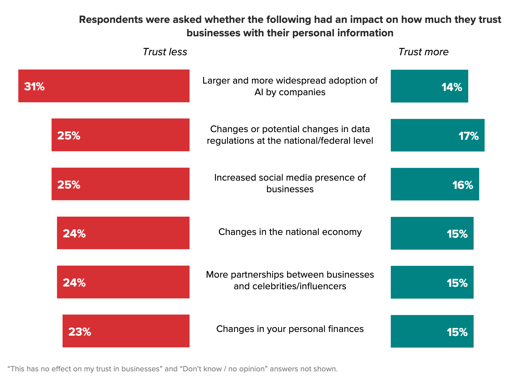 When asked whether several changes impacted their trust in business, the element most likely to push consumer trust to the negative side is larger and more widespread adoption of AI by companies: more than 3 in 10 said it would make them trust businesses less with their personal information. But other factors — like partnerships between businesses and celebrities or influencers and increased social media presence of businesses — also had a net negative impact on trust. Read more from our report exploring consumer trust in the age of AI.