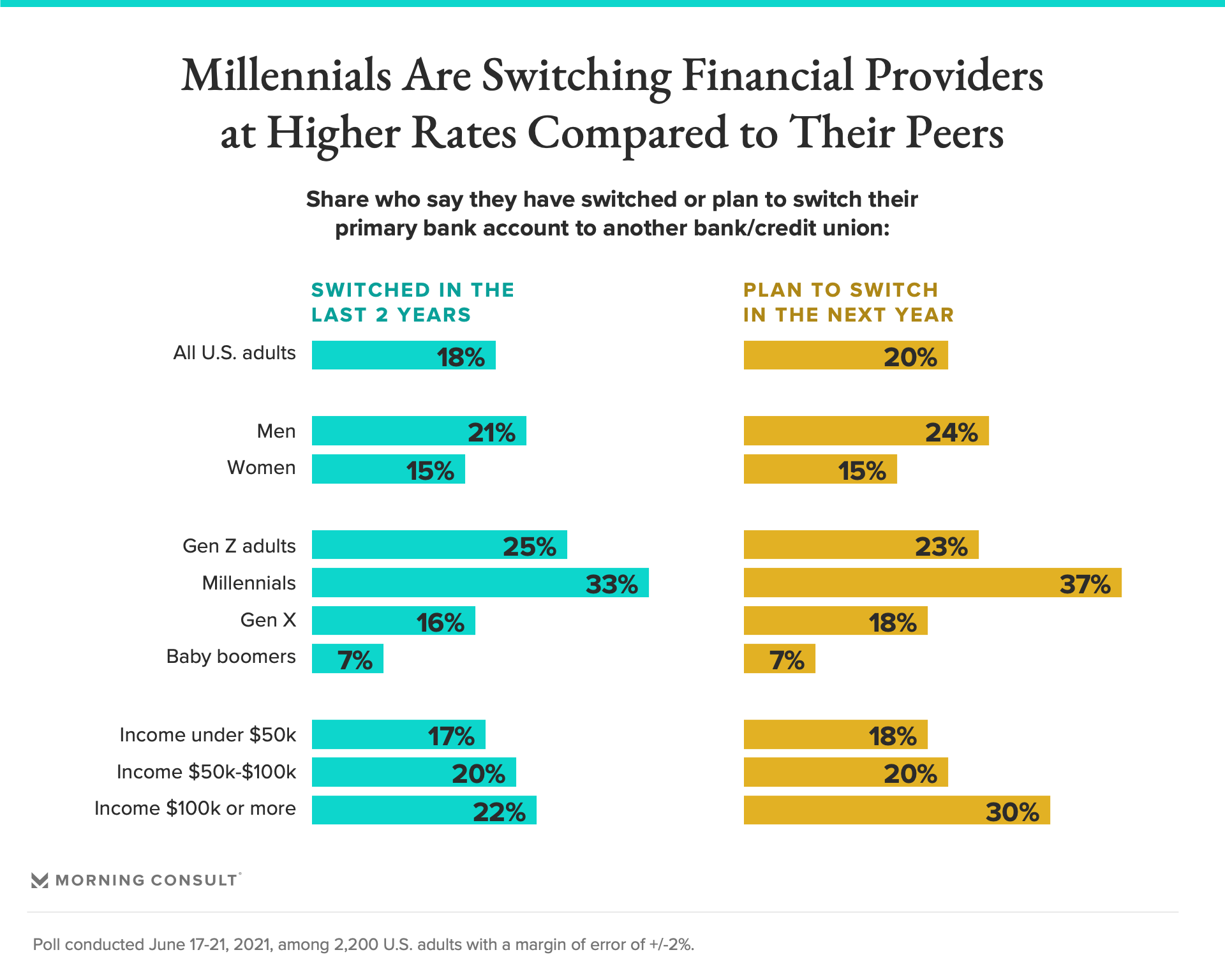 Roughly 1 in 5 adults say they have switched their primary bank in the last two years.