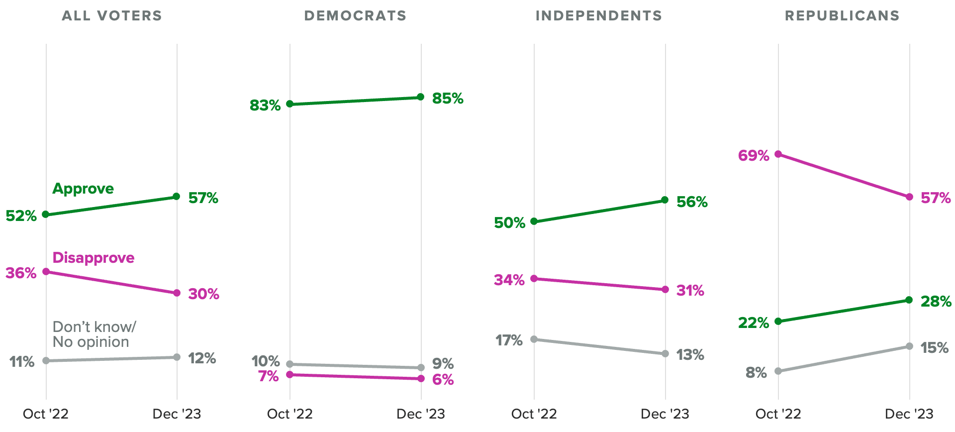 The GOP presidential front-runner’s lack of political discipline that brought a renewed focus on Obamacare could dampen the sting of Republicans’ economy-focused attacks on Biden if Democrats can continue to elevate it. Evidence from the 2022 midterm elections suggests that voters are willing to weigh issues that rank lower on their priority list (such as abortion that year) even if the economy tends to be their top issue.