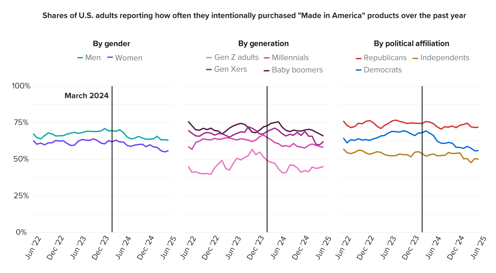 Declining enthusiasm for “Made in America” products among U.S. consumers is widespread. Relative to the start of our tracking three years prior, and particularly from Q2 2024 onwards, U.S. consumers’ demand for “Made in America” products has fallen across nearly all consumer demographics we examine. Democrats show the most pronounced decline. But GOP-aligned consumers also exhibit waning enthusiasm for the product segment. This suggests that partisanship – whereby Democratic consumers' views of American-made goods are colored by their rebuke of the Trump administration – does not fully explain the trend. Economic dynamics are likely playing a role. Download the full report for an in-depth assessment of U.S. consumers’ attitudes toward the “Made in America” product segment.