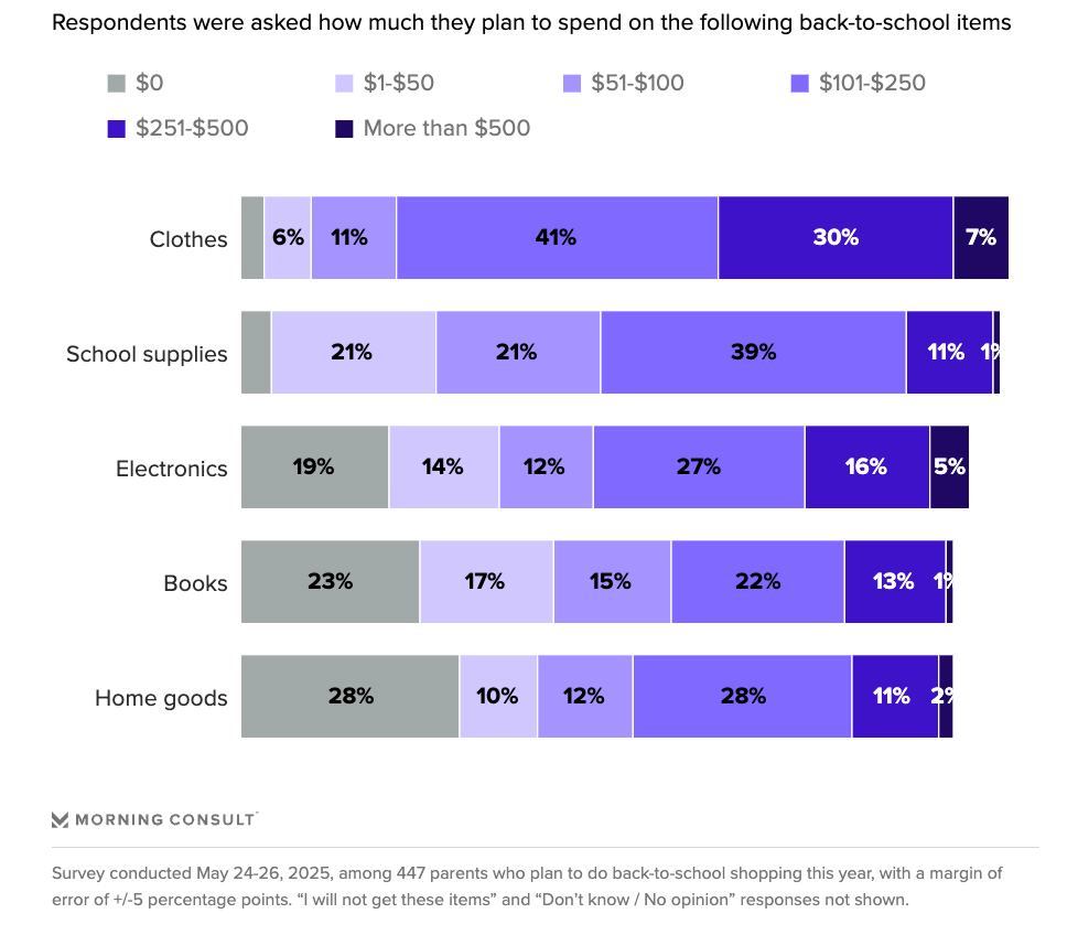 When asked how much they plan to spend on back-to-school overall, parents’ budgets are similar to 2024, with a plurality saying they anticipate spending between $251 and $500. That might mean buying fewer or lower cost items than what parents bought last year to compensate for higher costs. Clothing comprises the largest share of that budget, so tariffs’ impact on the apparel industry will be particularly painful for parents this season. Electronics and home goods — the latter a necessity for dorm-bound students — also require higher spending levels for parents outfitting their kids with those necessities (and nice to haves). Discover the categories causing the most sticker shock for back-to-school shoppers.