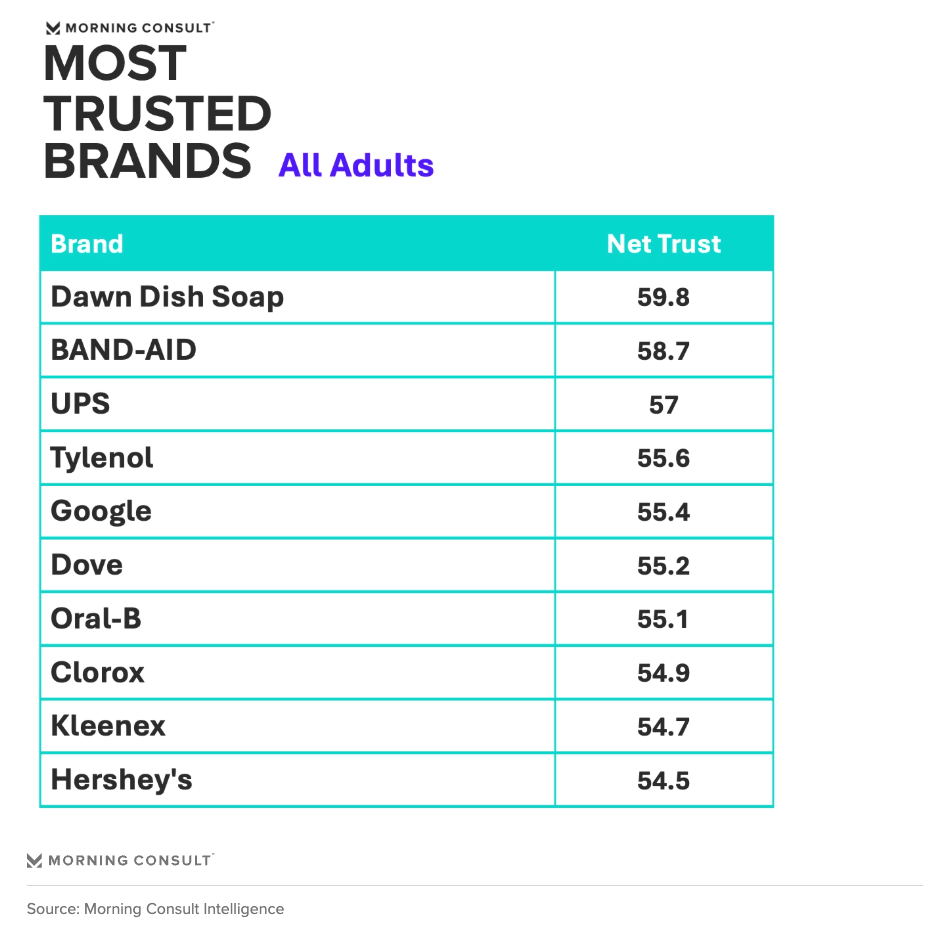 Brands like Dawn Dish Soap, BAND-AID, UPS, and Tylenol top the 2025 Most Trusted Brands list for all U.S. adults. These brands have become household staples, trusted for their reliability and consistent quality. In times of uncertainty, consumers gravitate toward brands that deliver on basic needs—echoing findings from Harvard Business Review that trust is often built on “competence and dependability.” Download the full report for more rankings among key consumer groups, including Gen Z.