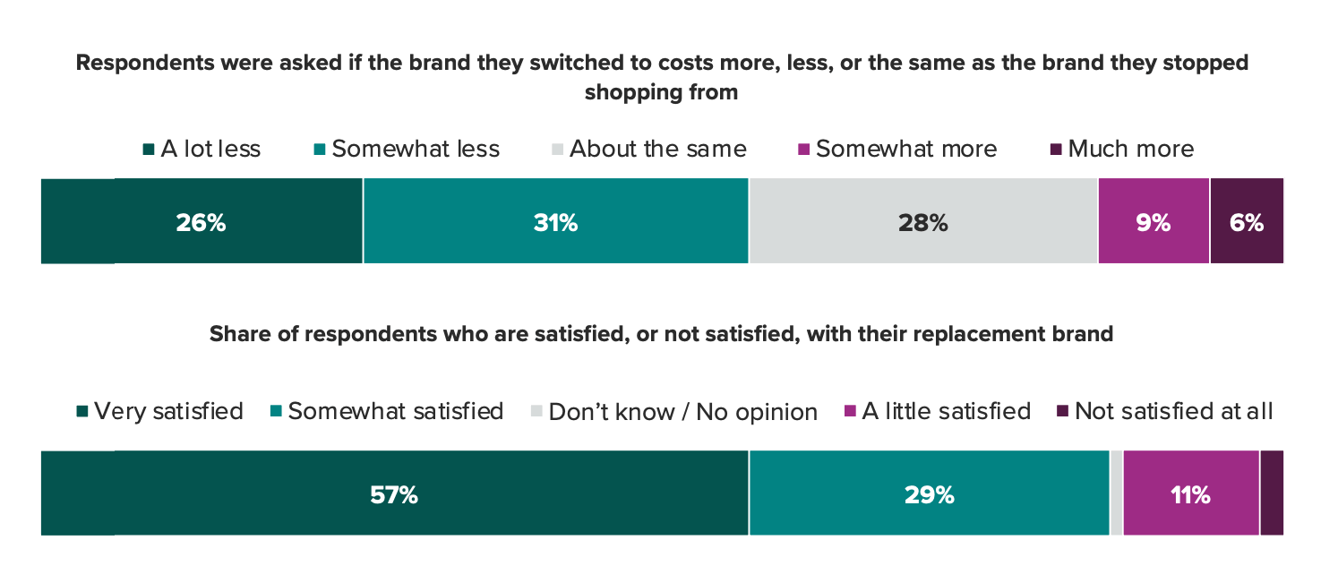 Consumers are walking away from their favorite brands to save money. Among consumers who say they swapped one brand for another, 57% reported that their new brand costs less. Saving money isn’t the only benefit to shoppers, they’re also satisfied with their new brand of choice. Plus, it doesn’t seem to be a particularly arduous task to find a replacement. Most (86%) shoppers said they found an alternative they liked within the first three new brands they tried.
