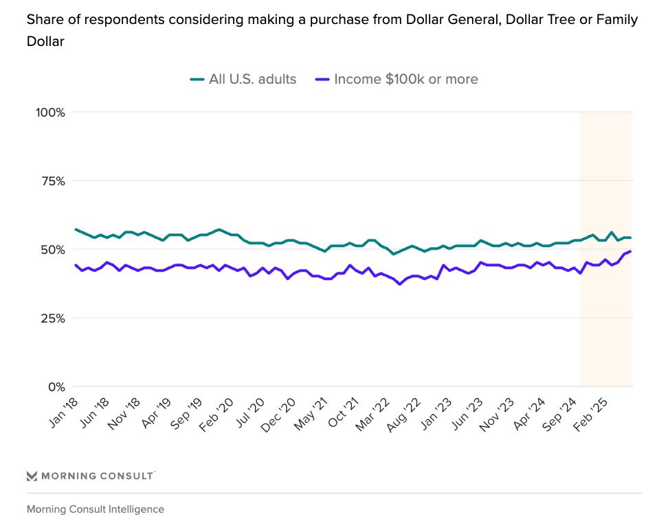 Per Morning Consult Intelligence, high-income shoppers have been increasingly including dollar stores in their consideration set since October 2024. We’ve seen an uptick in the share of those consumers who are “absolutely certain” or “very likely” to consider buying a product from Dollar General, Family Dollar or Dollar Tree, growing from 41% to 49%. Why the shift? This group’s consumer sentiment trended upward in the same time period, so they’re not doom spending. It’s more likely that they’re feeling the strain of price increases and trying to keep discretionary spending in check. This group is more likely to have kids at home than the overall population of six-figure households, and $100,000 just doesn’t go as far for larger households. See more shopping habits of high-income discount shoppers here.