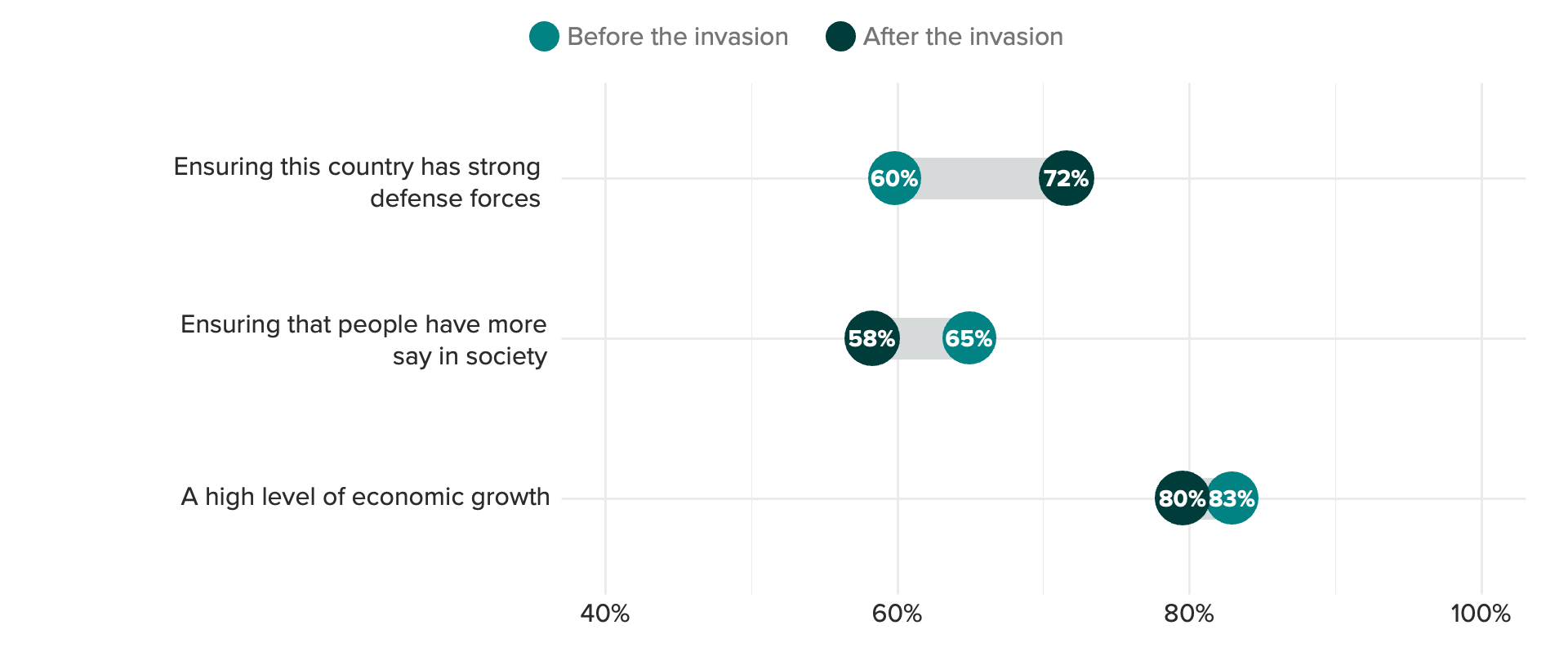 One year into the war, our data also shows declines in the shares of Russians saying that social agency and economic growth are important policy priorities in favor of greater military preparedness, though growth remains in pole position in absolute terms. Notably, this survey question asks about a 10-year time horizon, suggesting that many Russians are seemingly projecting themselves into an even more bellicose future.
