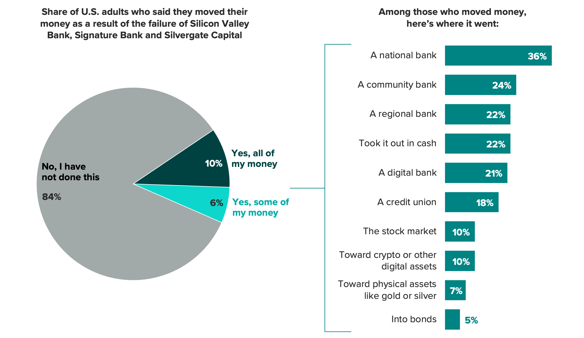 16% of U.S. adults said they moved their money as a direct result of the failures of Silicon Valley Bank and Signature Bank and the collapse of Silvergate Capital, with a plurality of those adults (36%) saying they moved their money to a national bank.