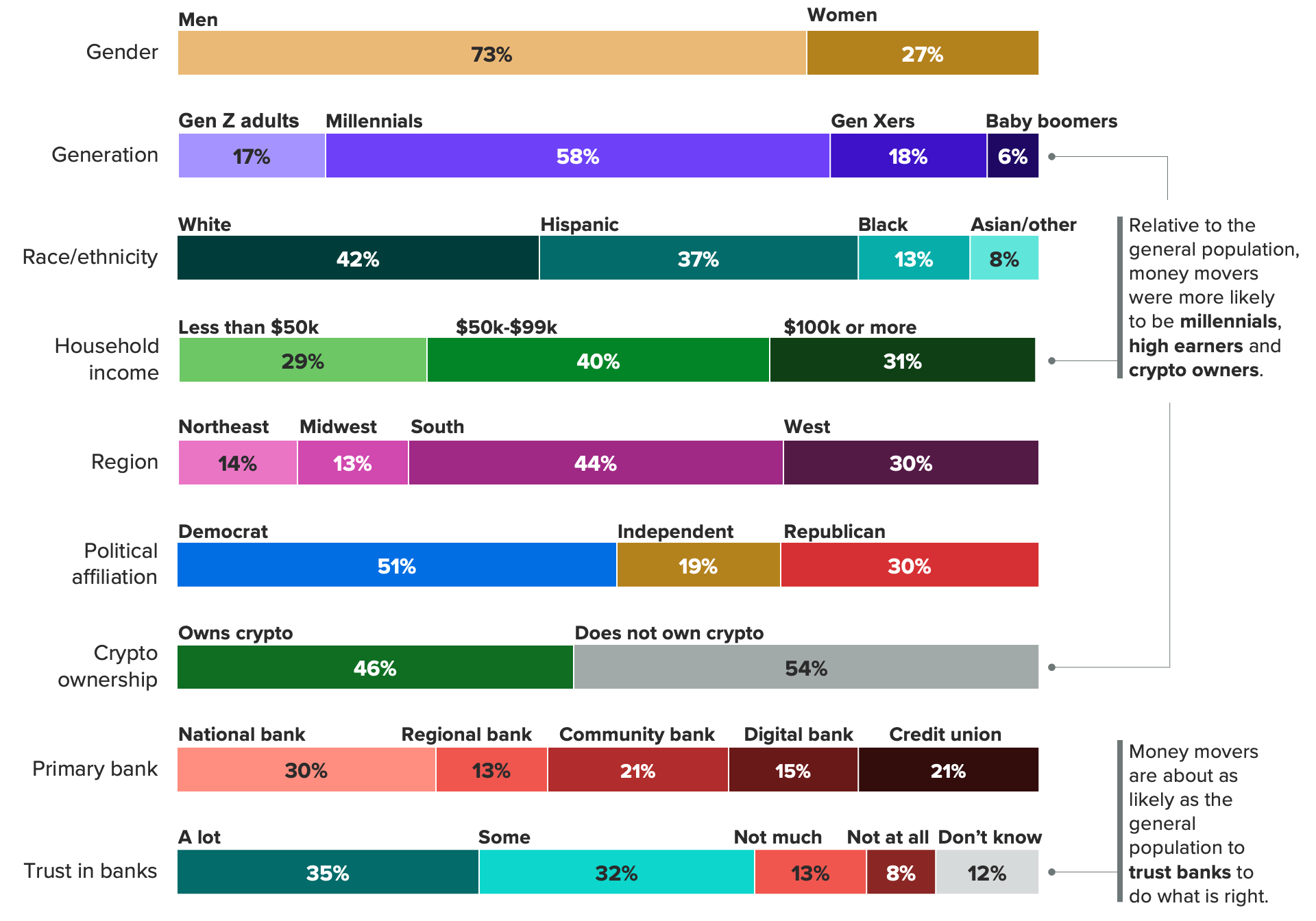There are several distinctive characteristics of those who moved their money as a result of the recent bank failures. They were disproportionately high earners, they were much more likely to own cryptocurrency than the general population and a majority were millennials.