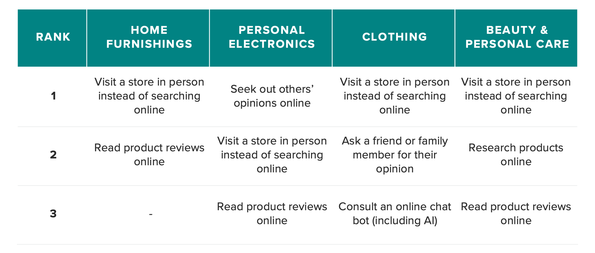 The good news is that the solution to increasing the likelihood of purchase is accessible to most shoppers. Visiting stores to see or test a product in person was a consistent driver of a successful purchase, and a common behavior across all categories tested. Similarly, doing research and reading reviews online is something a majority of uncertain shoppers did that helps to drive conversion.