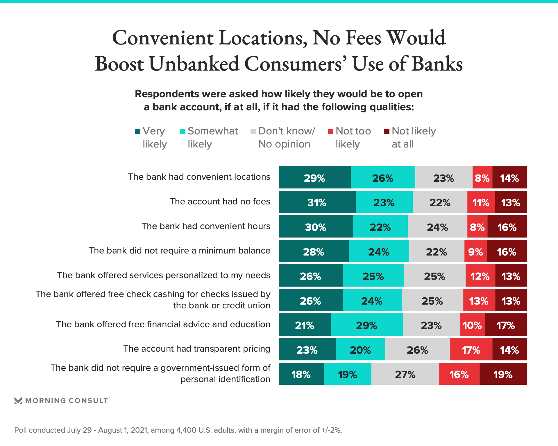 And of the 53 percent of unbanked U.S. adults who are interested in having a bank account, convenient locations and hours, no fees and no minimum balances are top attractions.