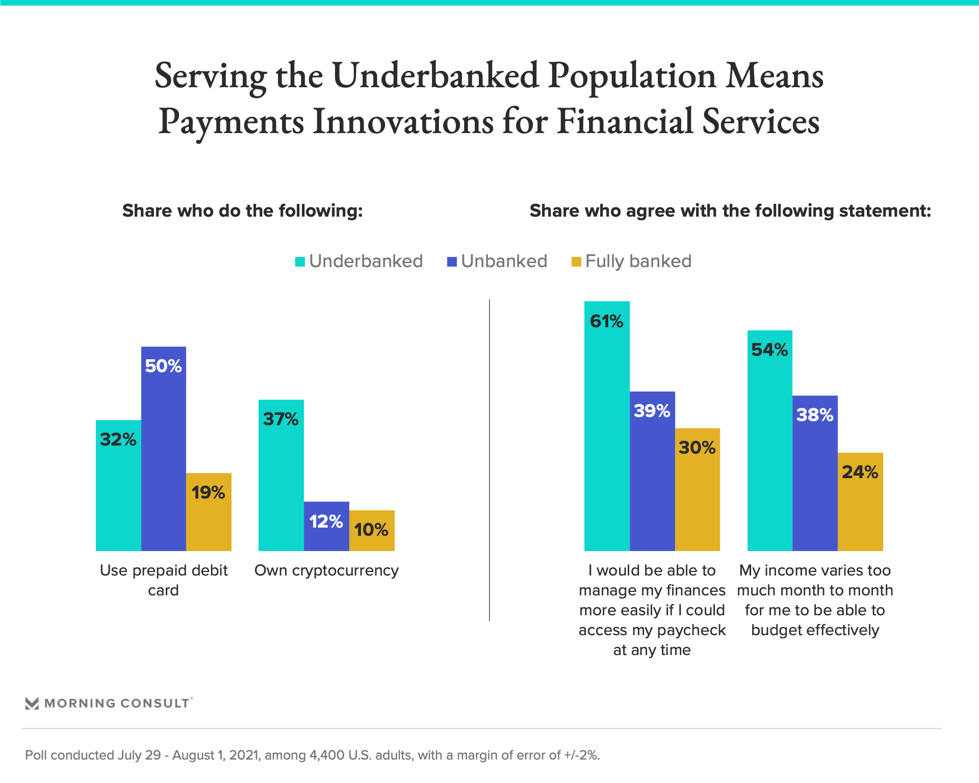 Underbanked adults see the lack of payments innovation in banking, so much so that a majority (58 percent) say they could manage their finances just as easily without a bank or credit union account, compared to 34 percent of fully banked adults (those who do not use alternative financial services) that say the same. Underbanked adults don’t just need a place to stash their money, they need the vehicles to send and receive it. Besides using payday lenders, bill pay services and money orders, underbanked adults are also more likely to use prepaid debit cards and own cryptocurrency in order to make payments.