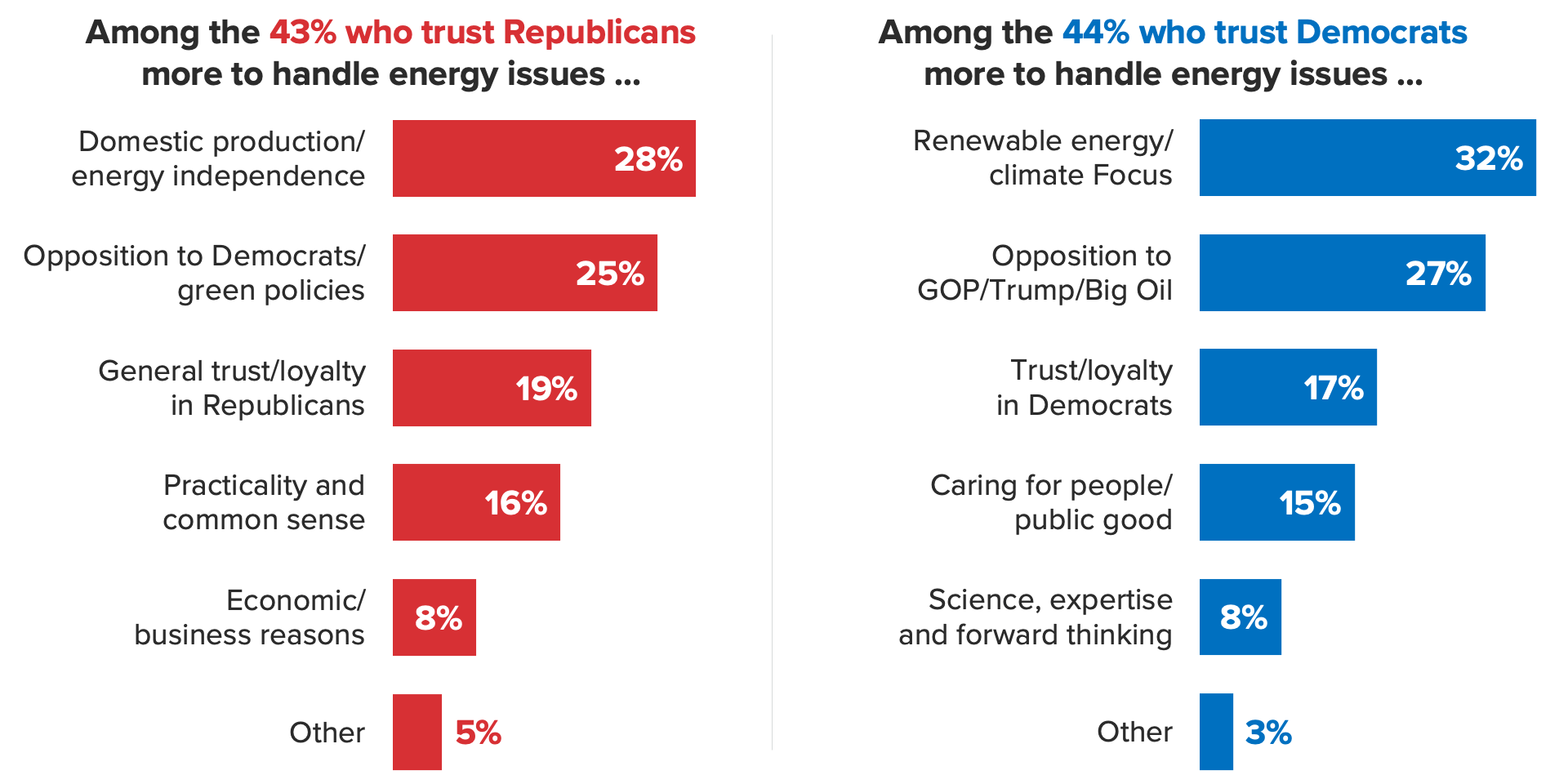 While it’s clear that partisanship is the strongest indicator of trust on energy, the respondents citing somewhat softer factors look more open to switching to the Democratic position than the Republican side. Roughly a quarter of voters cited economic or practical reasons for trusting congressional Republicans, with one respondent arguing, they “ plan to make us energy independent again,” and another adding, "They have more common sense policies rooted in reality.”
