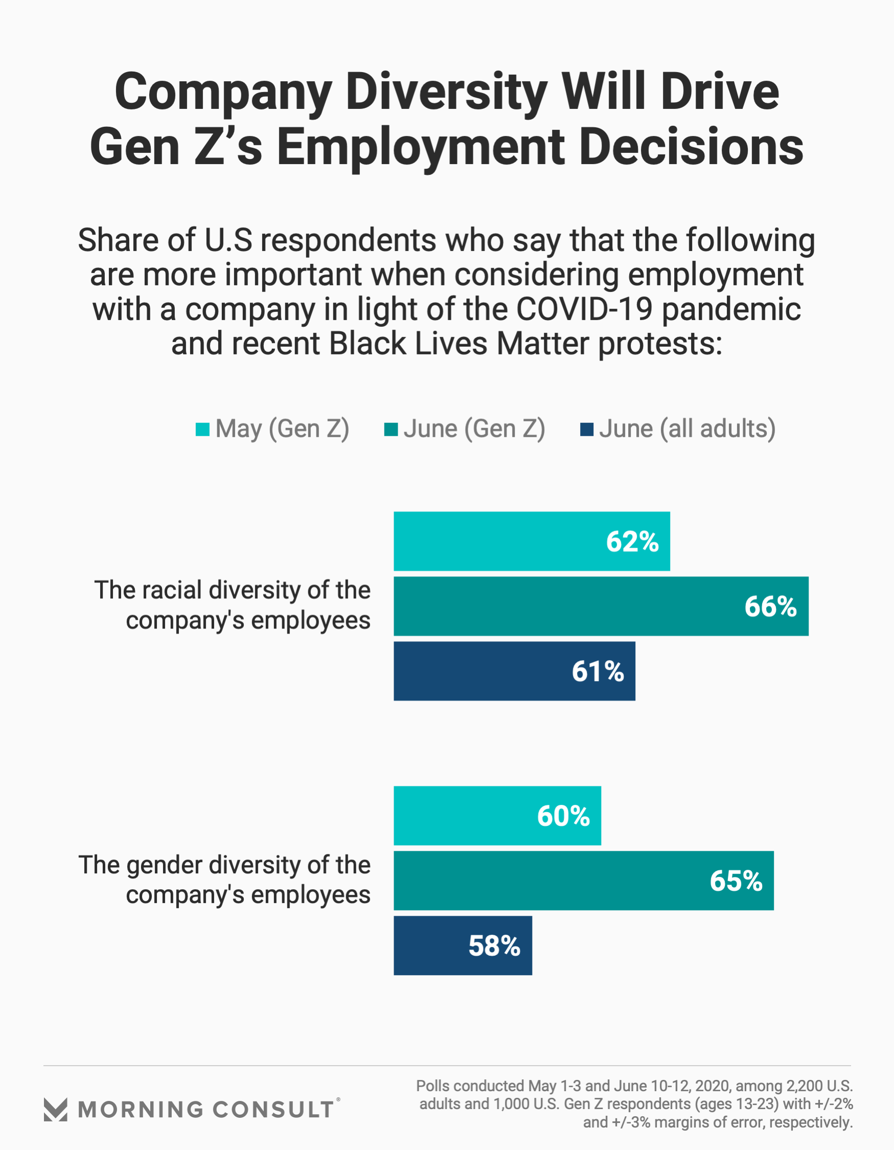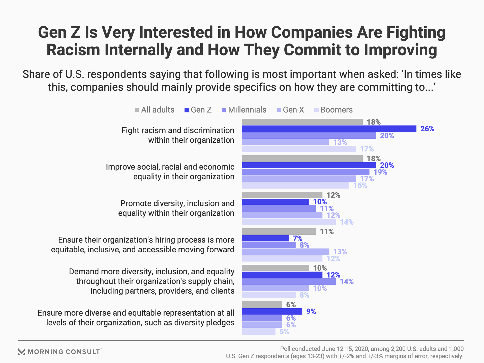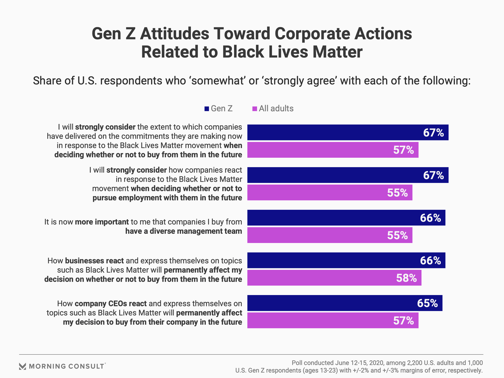 Compelling implications from a talent perspective put further pressure on companies to act and change versus promise and hope that people will forget: Gen Z is notably more likely than other generations to say that they'll strongly consider how companies react in response to BLM when deciding whether or not to pursue employment with them in the future (67 percent versus 57 percent among all adults).
