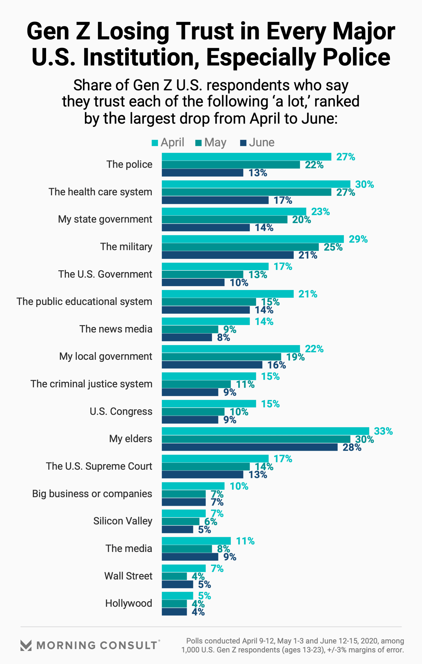 Gen Z has a characteristically widespread distrust of those in power and a sense that the world isn’t fair, and Morning Consult tracking of 1,000 Gen Z respondents (ages 13-23) finds that these sentiments are only strengthening in the context of a global pandemic and severe national unrest. Only 5 percent now strongly agree that the world is a fair place; since May, there’s been a 20 percentage point decrease in the share of this generation that trusts people in power to do the right thing given the events of the past few weeks; trust in nearly every major U.S. institution is declining, and Gen Z’s optimism about the future of both the world more broadly and the United States specifically continues to fall.