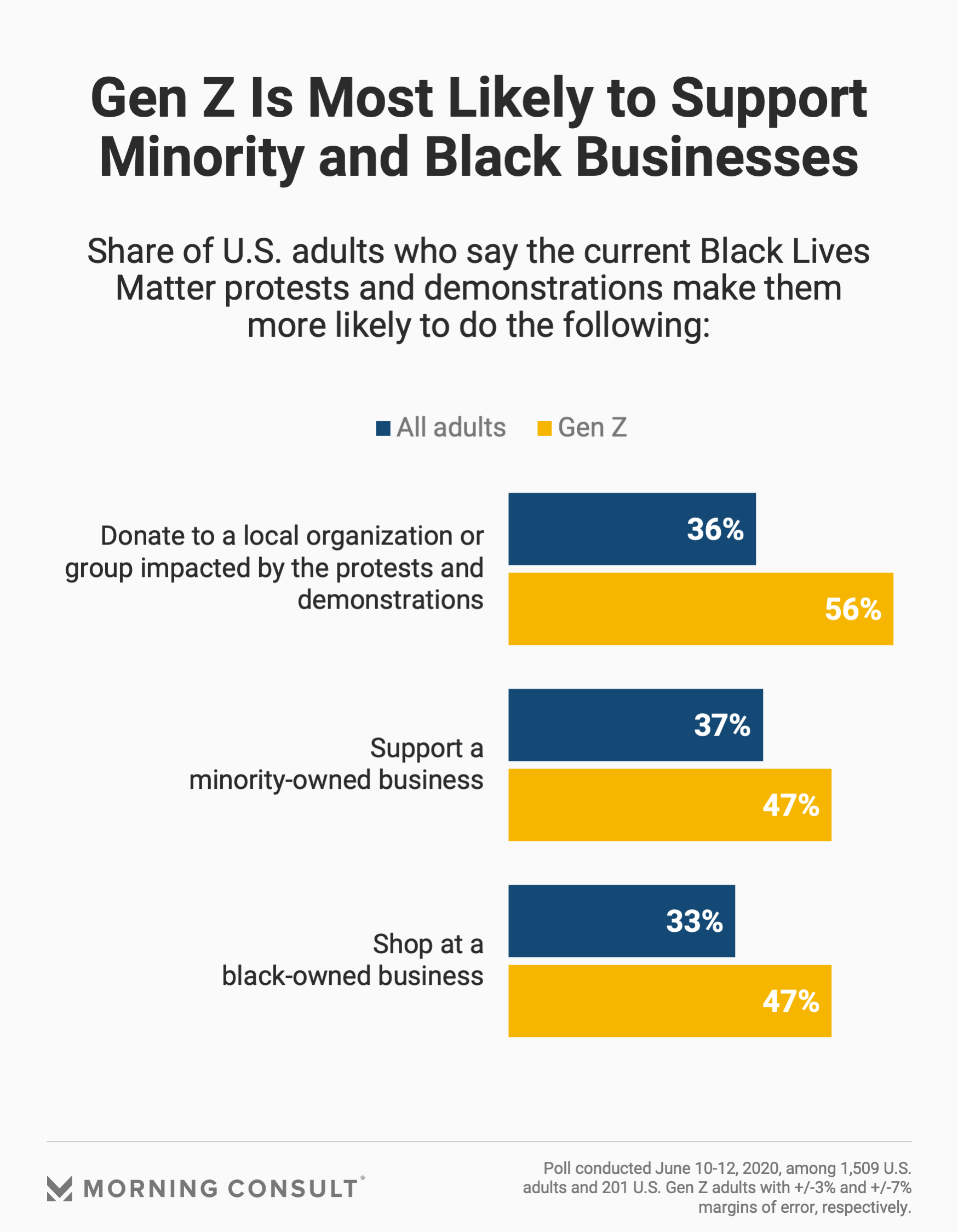 But beyond voting at the polls, Gen Z will increasingly be voting with their wallets to ensure long overdue steps toward addressing systemic racism are taken in boardrooms, as well as in Washington. Especially given their lack of trust in those in power, particularly as relates to Washington, what matters more to this generation than voting or defunding the police is remedying the underlying issues that have led to today’s vast inequities and injustices -- and in the short term, supporting those who’ve been wronged. Gen Z is 42 percent more likely than all adults on average to shop at Black-owned businesses because of Black Lives Matter, and a similar share, nearly half, say they’re more inclined to support minority-owned businesses in light of this movement.