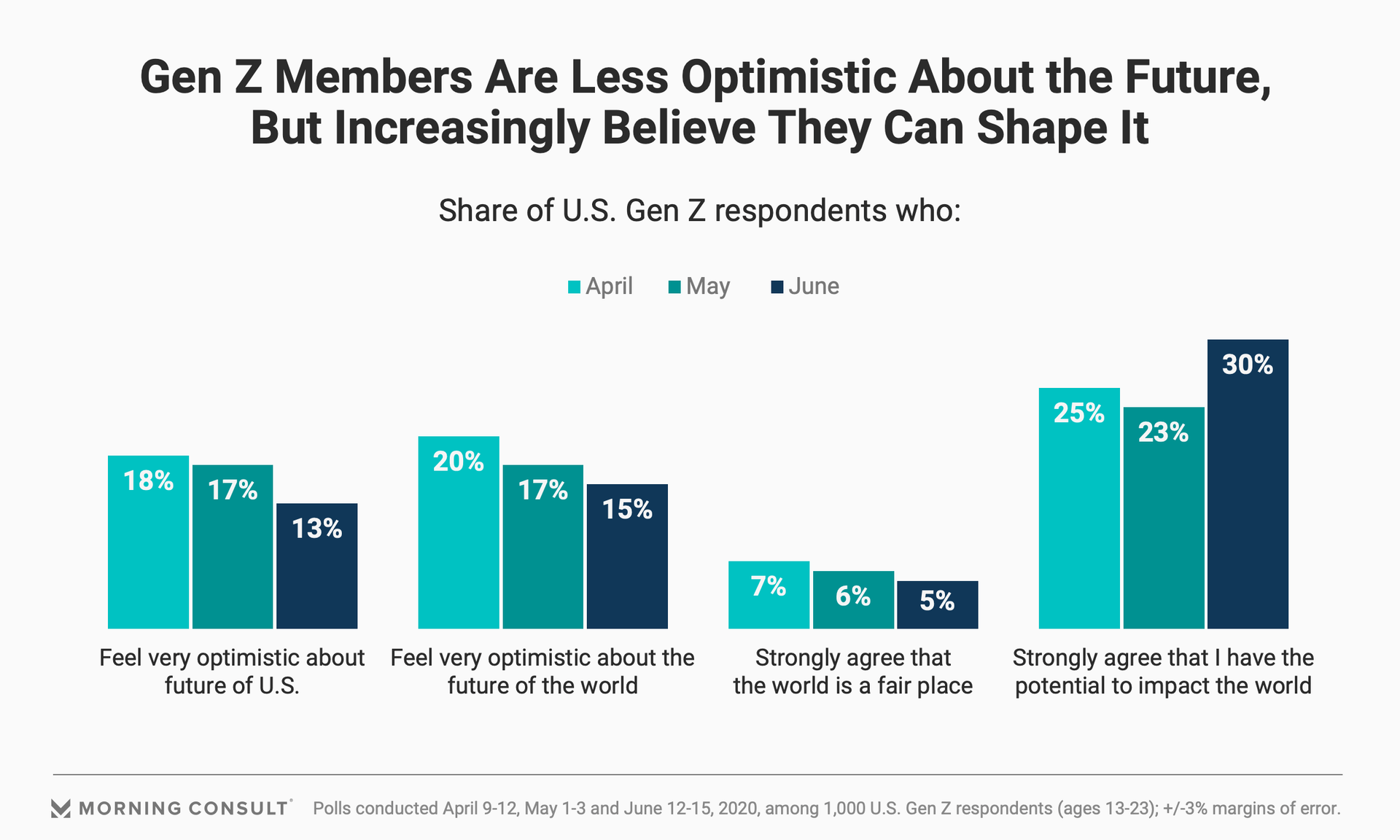 But while the share of Gen Z members who feel that older generations have made the world a worse place continues to rise, up 7 percentage points since April, so too is the share who feels that younger generations will make it a better place, up 8 points since April. And the share of this generation believing that they have the potential to impact the world is also rising, with 30 percent strongly agreeing that this is true in June versus 23 percent strongly agreeing in May.