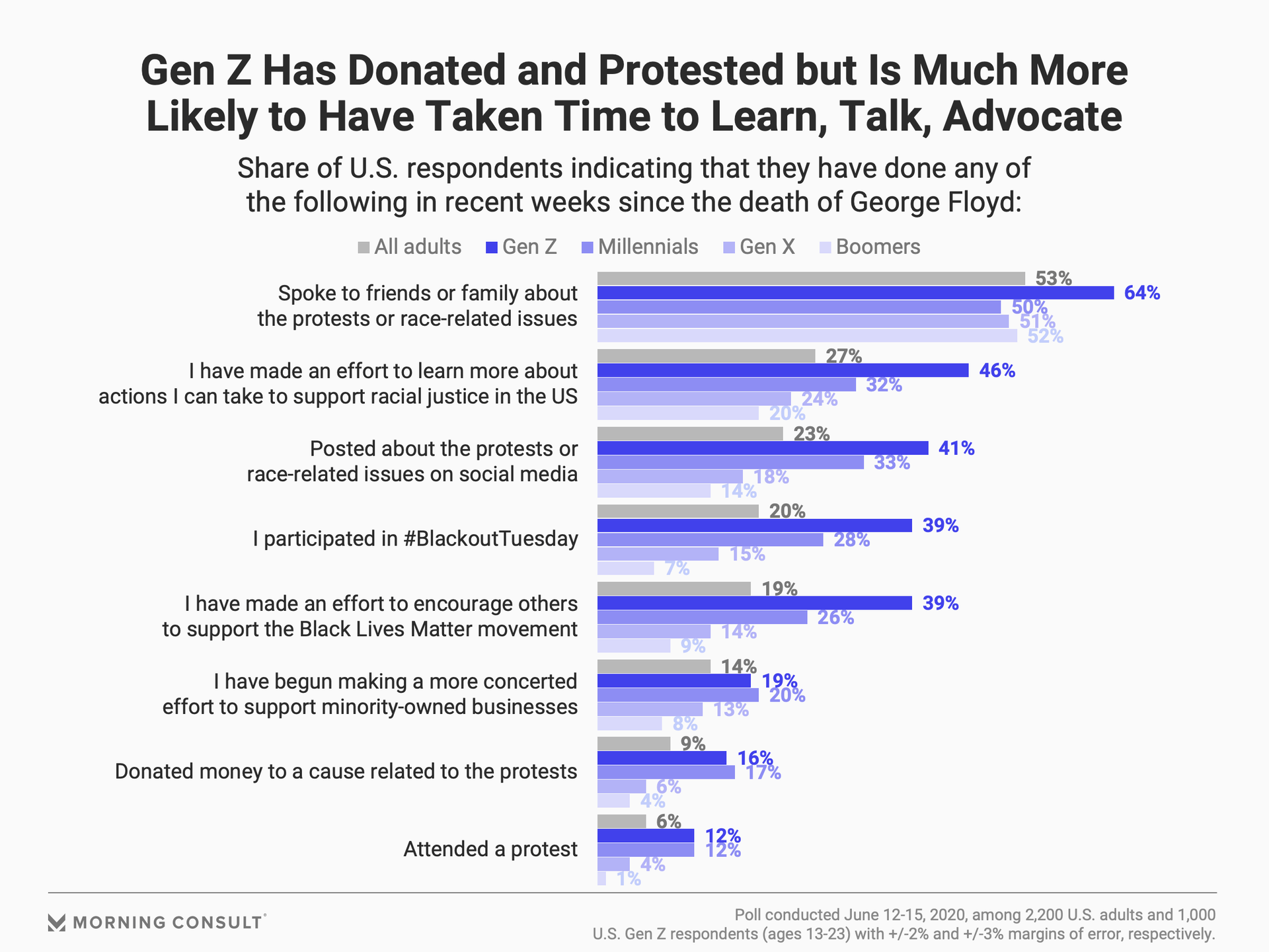 With 81% of Gen Z saying that protests have made them more aware about race issues in America, they’ve not only taken action but also taken initiative: About half (46%) have made an effort to learn more about actions they can take to support racial justice in the United States, and 64% have initiated conversations with their friends and family on the topic.