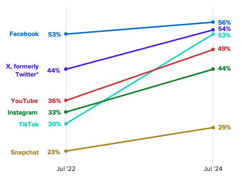 Use of TikTok for news among its users has grown substantially over the last two years, despite the platform having been synonymous with entertainment content since its inception. More than half (53%) of TikTok users said they turn to the app for news in July 2024, a 23 percentage point increase from July 2022. This growth is reflective across key groups, like Gen Z adults, millennials and members of major political parties, which already consumed news on TikTok at higher rates.