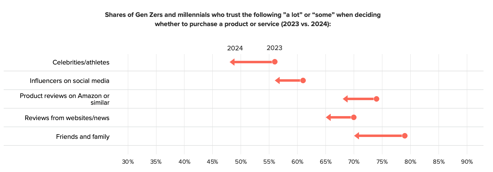 - Trust in influencers is declining: The share of social media users who trust influencers dropped 5 percentage points since last year.