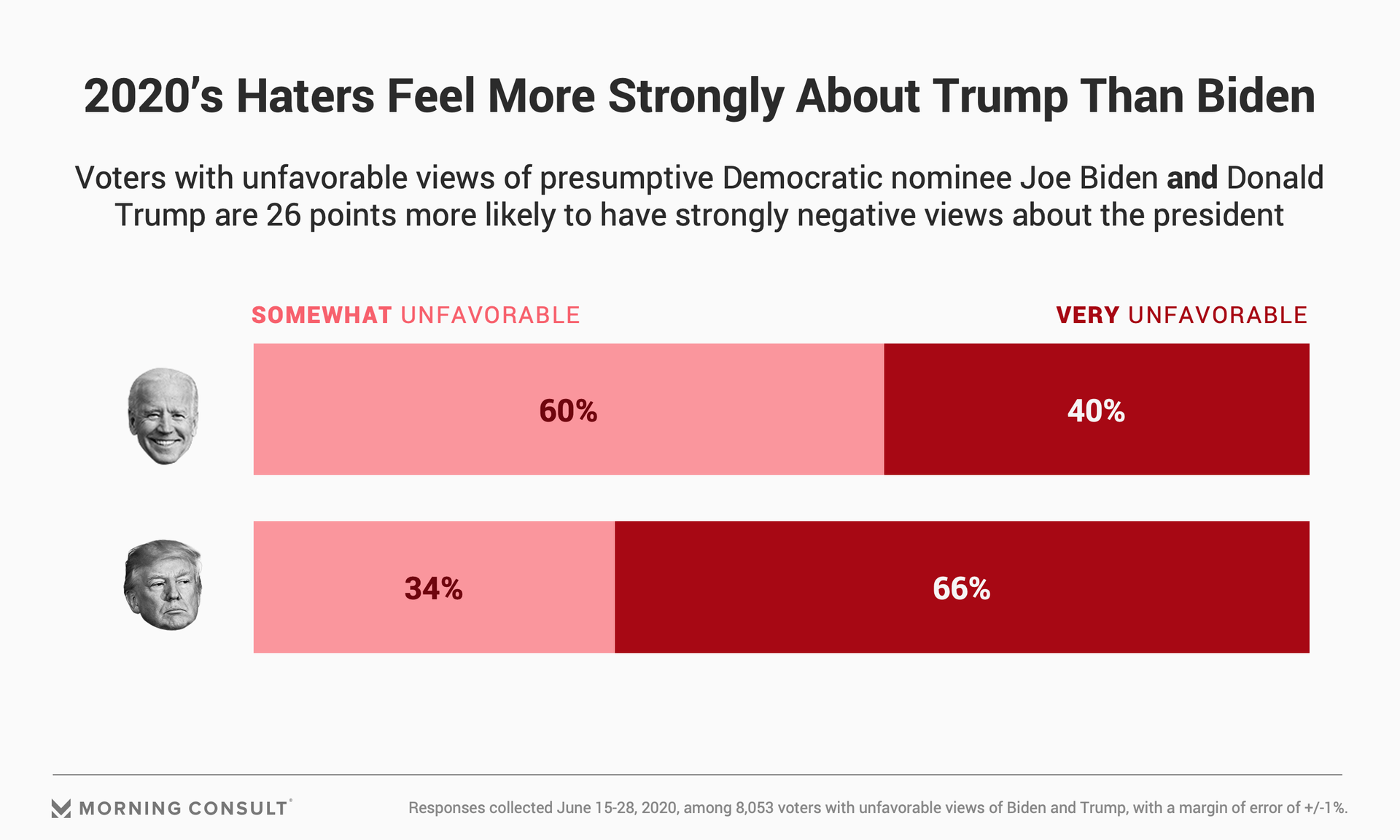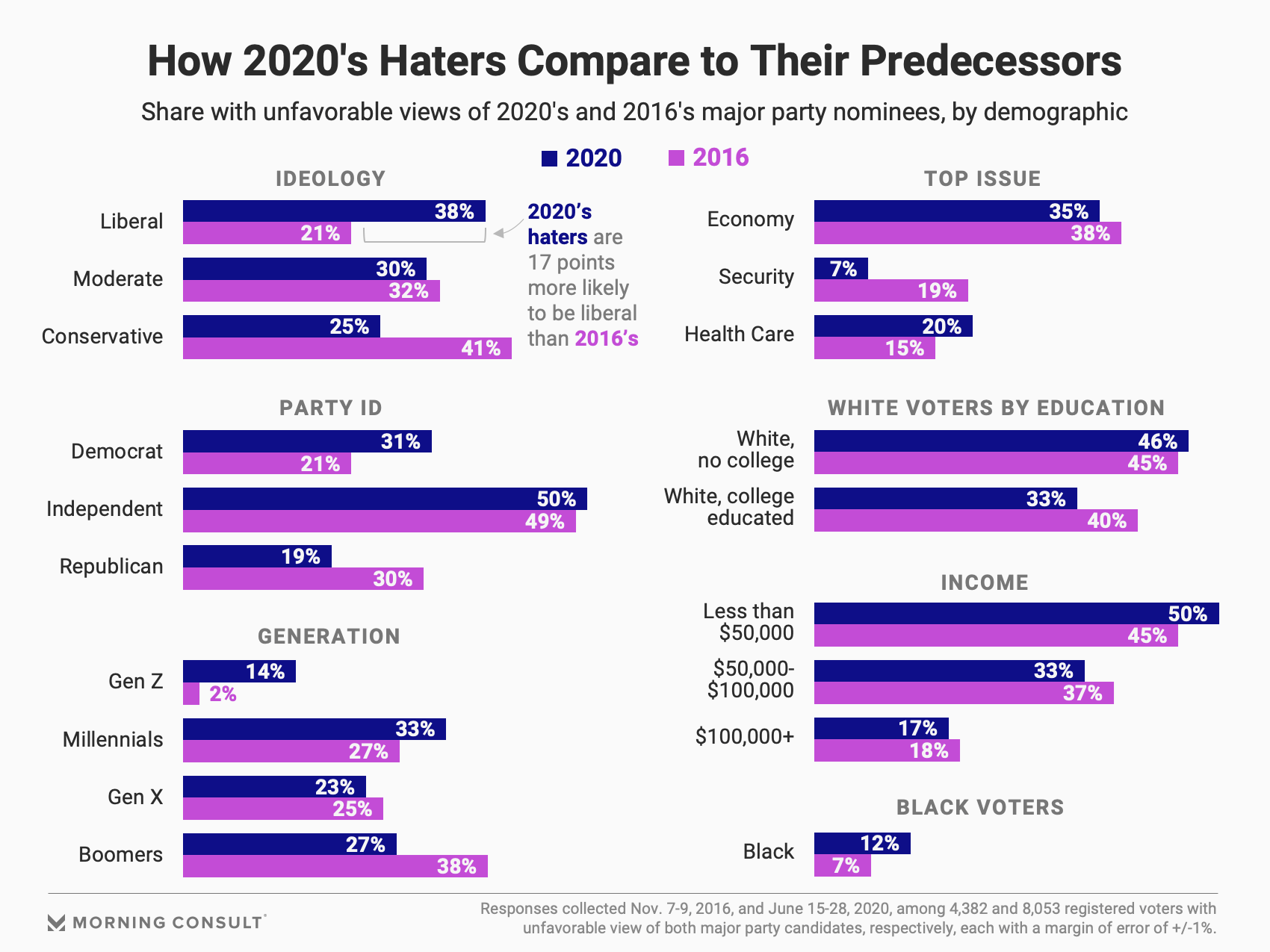 Voter sentiments can change over time, and while Morning Consult data has shown stability in its numbers among the hater demographic, Election Day is just under four months away. Trump’s 2016 campaign didn’t even begin tracking the double-haters until August of that year, and dramatic moments that hurt voter sentiments, such as then-Federal Bureau of Investigation Director James Comey’s letter regarding Clinton’s emails or the release of the Access Hollywood tape, didn’t happen until October.