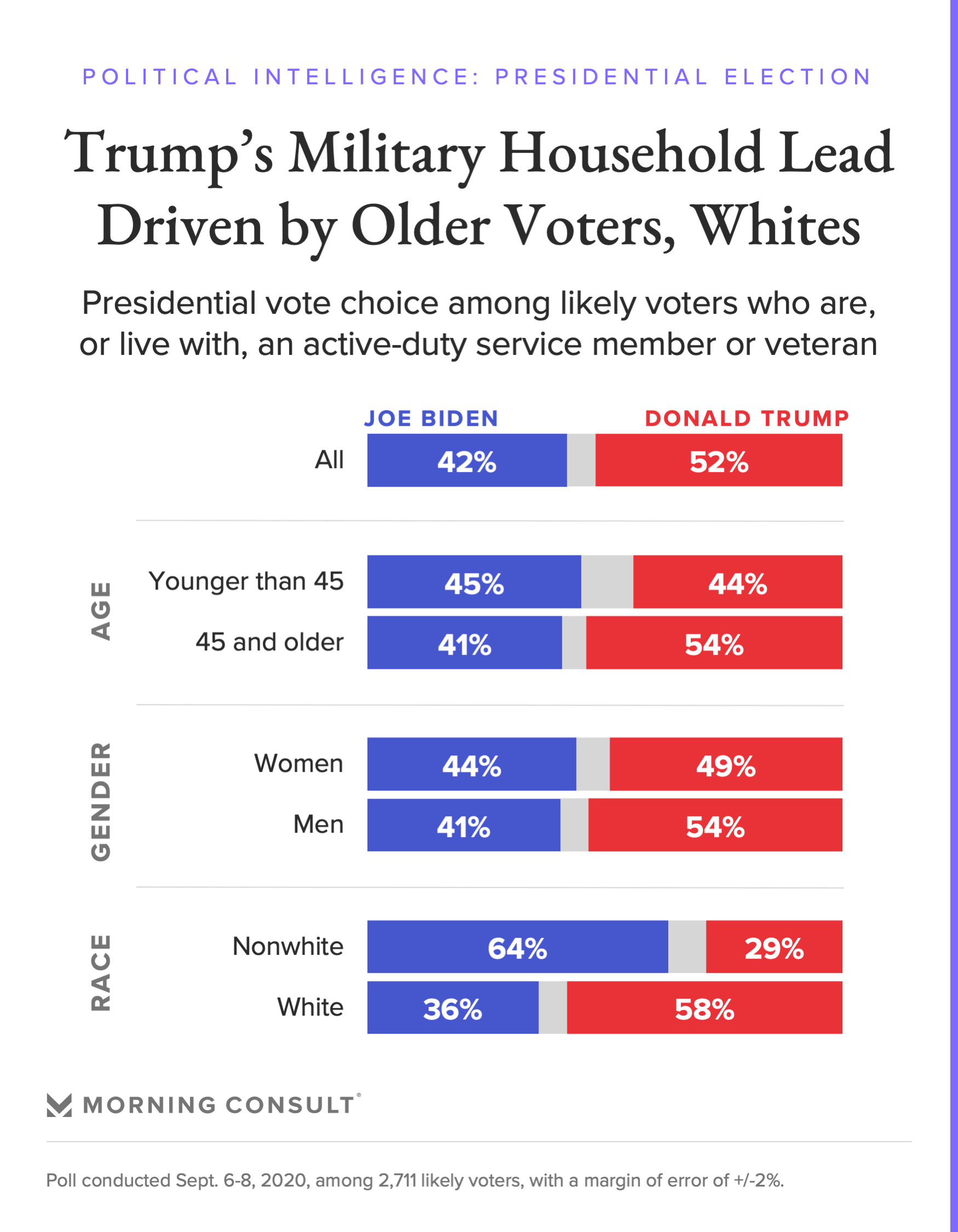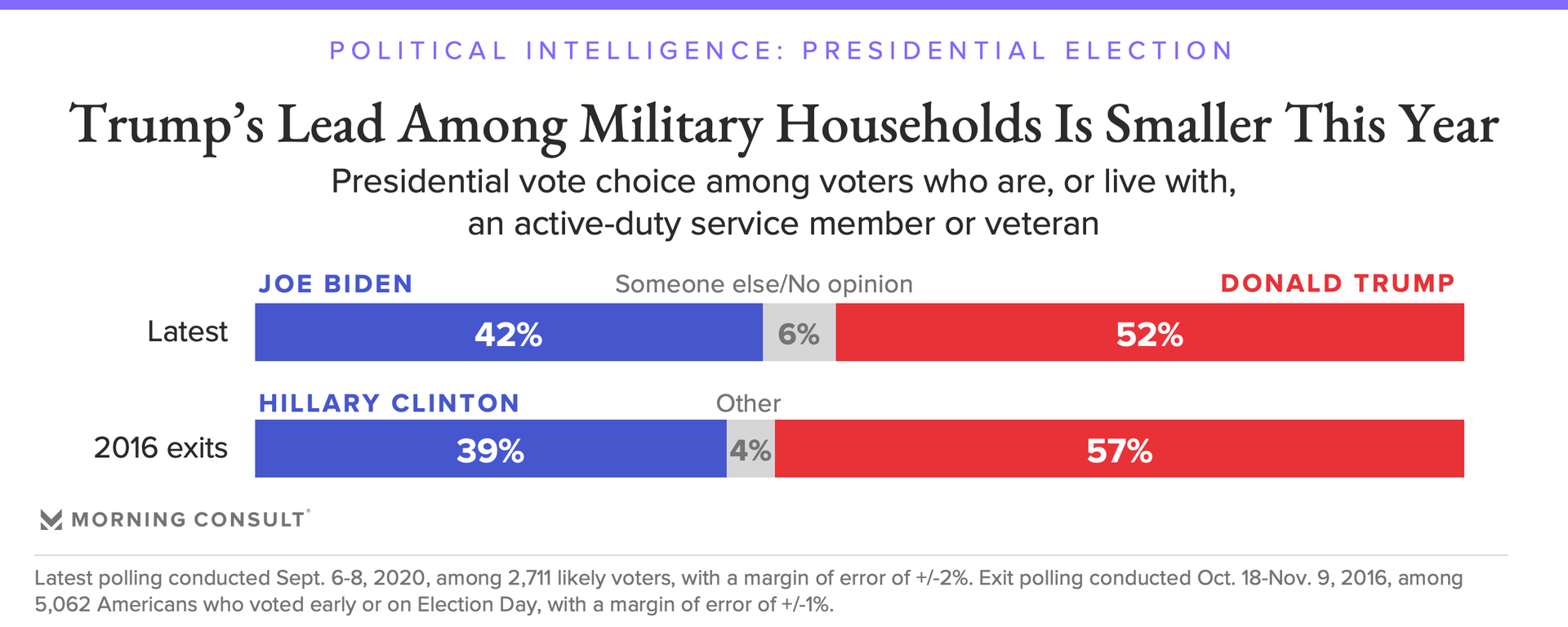 Morning Consult daily tracking conducted Sept. 6-8 found Trump leading Biden by 10 percentage points, 52 percent to 42 percent, among 2,711 likely voters in military households -- those who said they are, or live with, an active-duty service member or veteran. But his advantage with the group has decreased since the 2016 election, when he won military-affiliated voters by 18 points, 57 percent to 39 percent, according to Morning Consult exit polling.