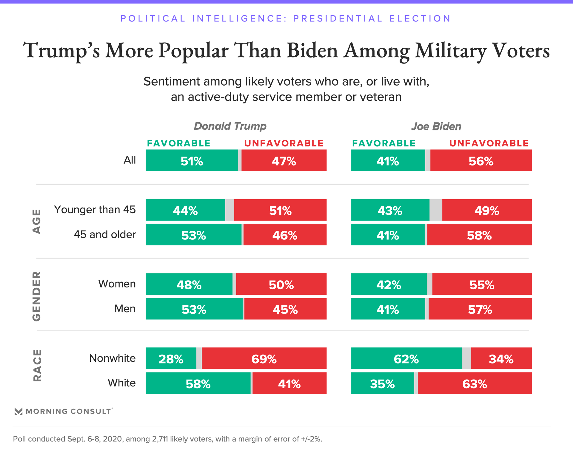 President Donald Trump’s lead over Democratic nominee Joe Biden among military families has not wavered in recent days as he’s faced fallout following a report from The Atlantic that said he routinely denigrated service members in private conversations with aides and advisers. Still, despite a significant edge with military-affiliated voters, new Morning Consult polling shows Trump’s advantage with the group is smaller than it was four years ago.