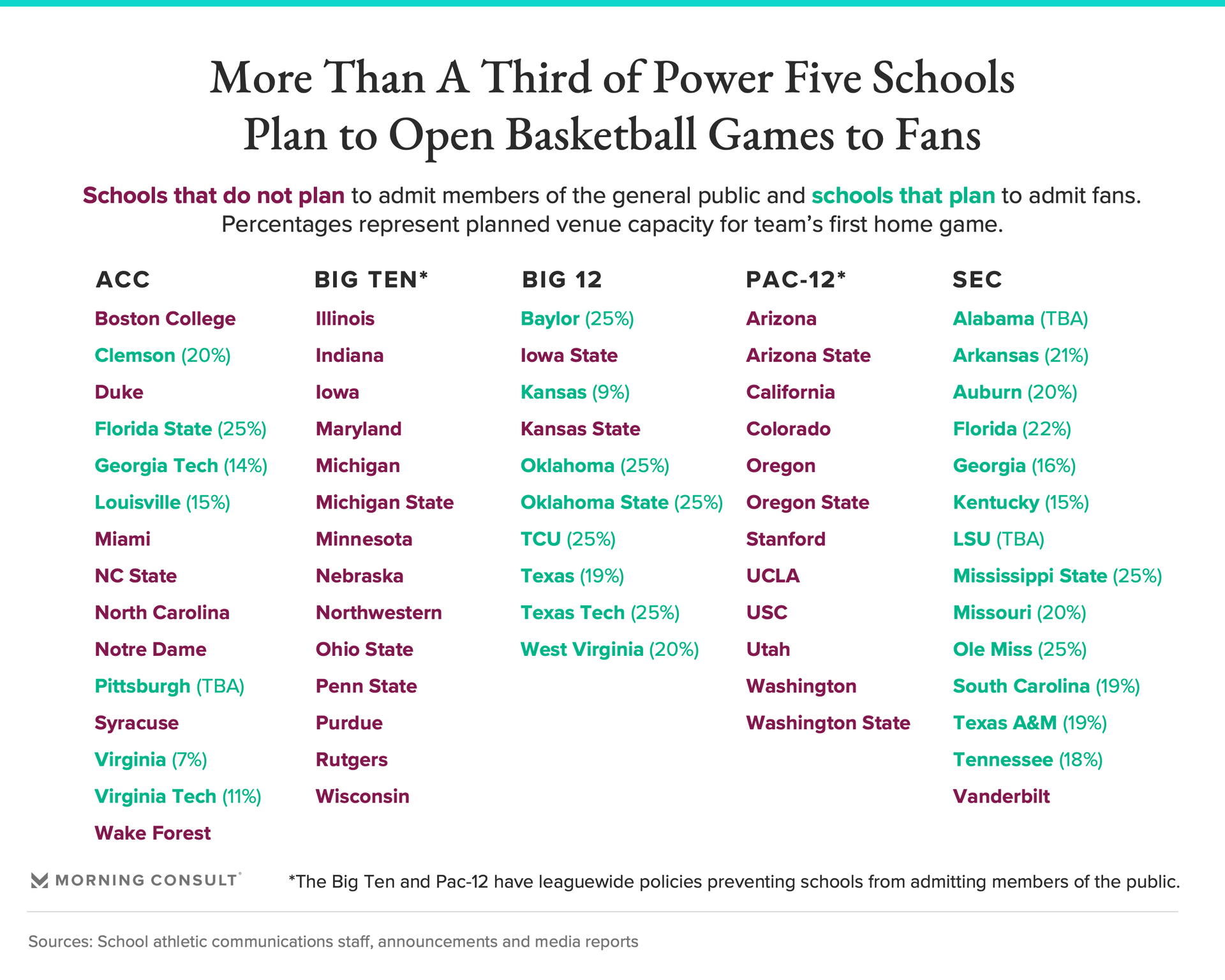 More than a third of the 65 schools in the Power Five conferences plan to allow members of the general public to attend their late-November or early-December basketball home openers in limited numbers, according to announcements and media reports, with permitted crowd sizes as high as 4,000 people or 25 percent of a given arena’s capacity. Those policies are subject to change as schools react to new coronavirus developments, and states and municipalities issue new guidance and regulations.