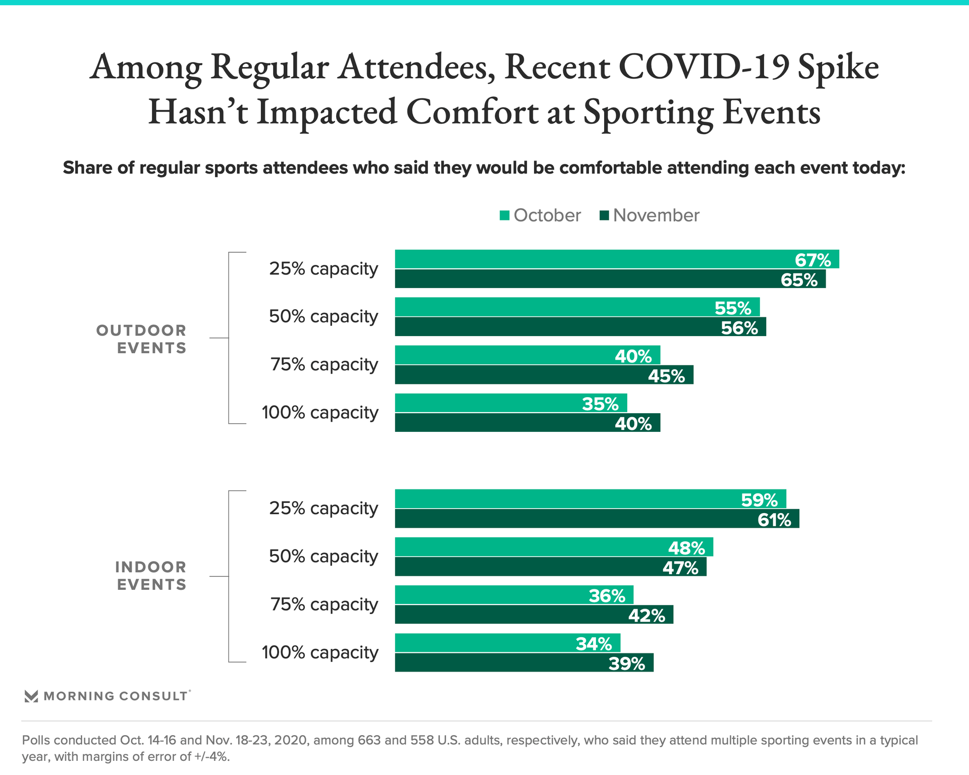 In a Morning Consult poll conducted Nov. 18-22, 40 percent of U.S. adults said they would be “very” or “somewhat” comfortable attending an indoor sporting event or concert with attendance capped at 25 percent of the venue’s capacity. Among those who indicated they attend multiple sporting events in a typical year, 61 percent said they would be comfortable attending an indoor event with attendance capped at 25 percent. Despite the recent coronavirus surge, both of those figures are virtually unchanged from an October survey.