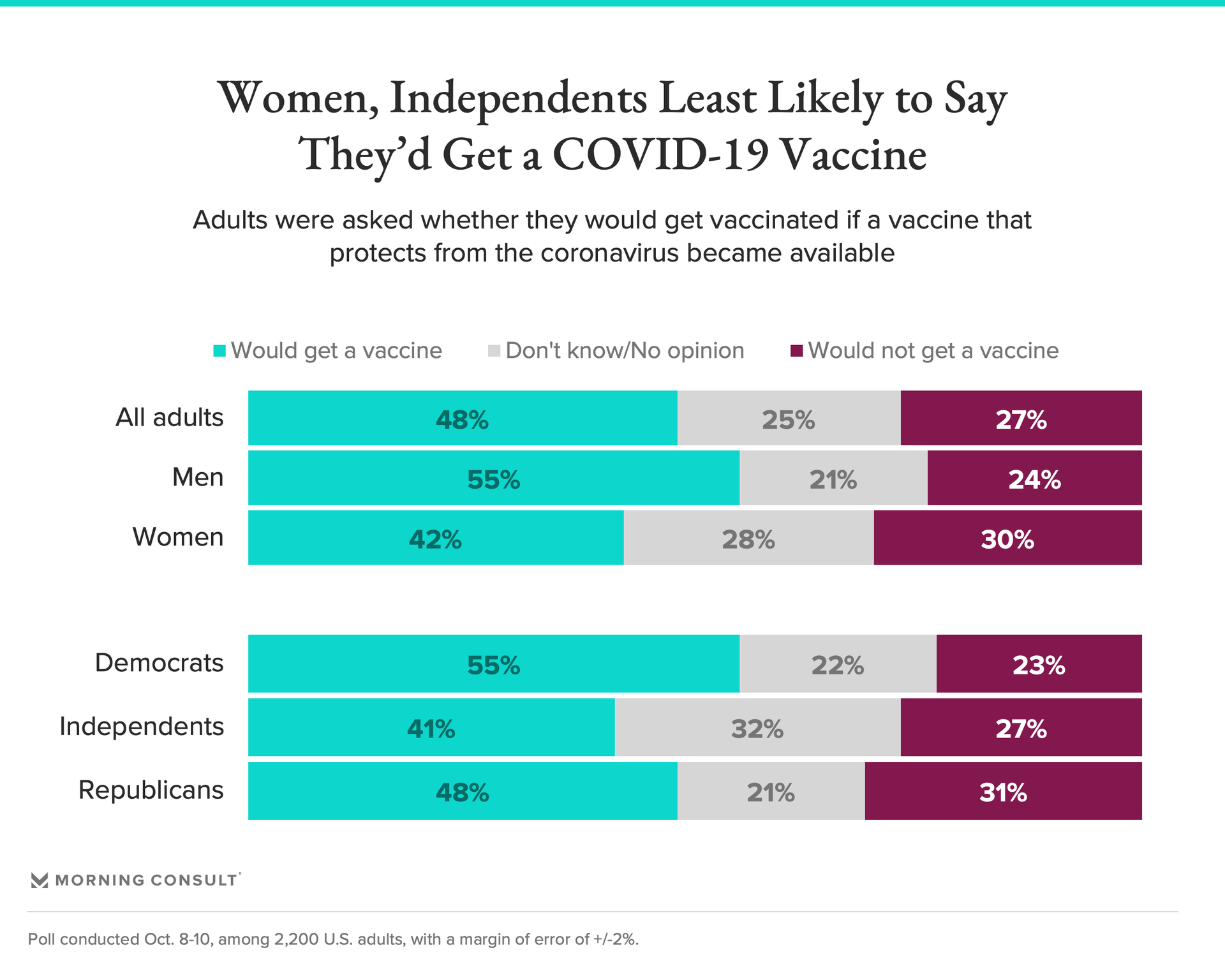In the Oct. 8-10 poll, 55 percent of Democrats said they'd seek a coronavirus vaccine, down from 60 percent the week before, while the share among Republicans remained level at 48 percent and independents dipped 2 points, to 41 percent.
