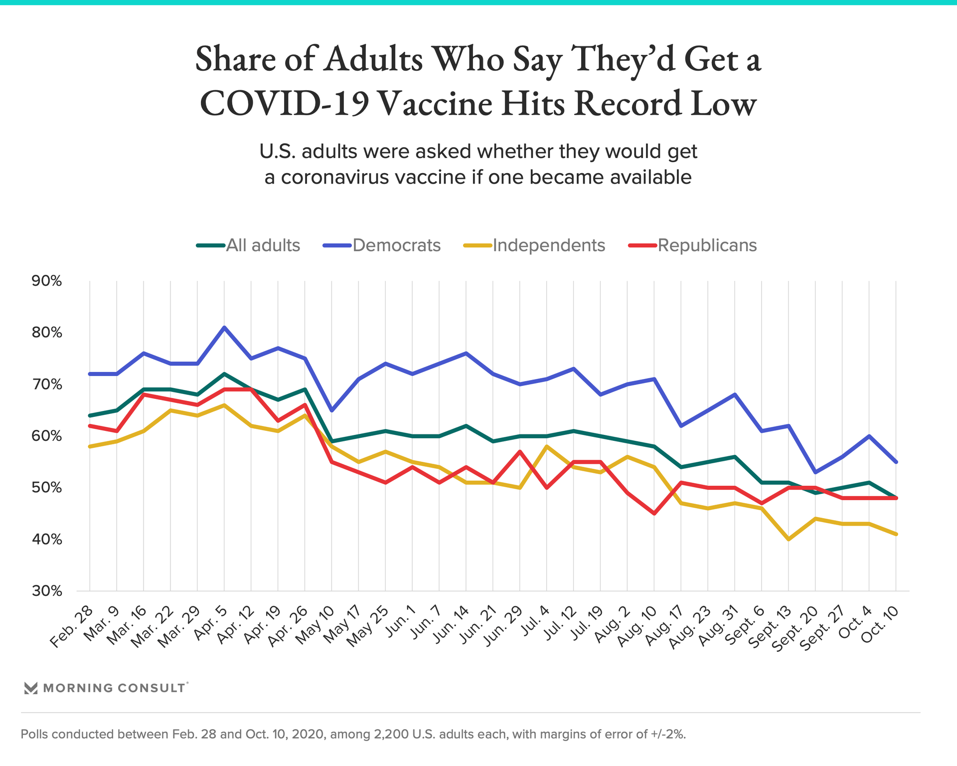 The share of adults who say they'd get a coronavirus vaccine if one became available reached 48 percent, the lowest point in Morning Consult polling, as confidence wavered among Democrats last week.