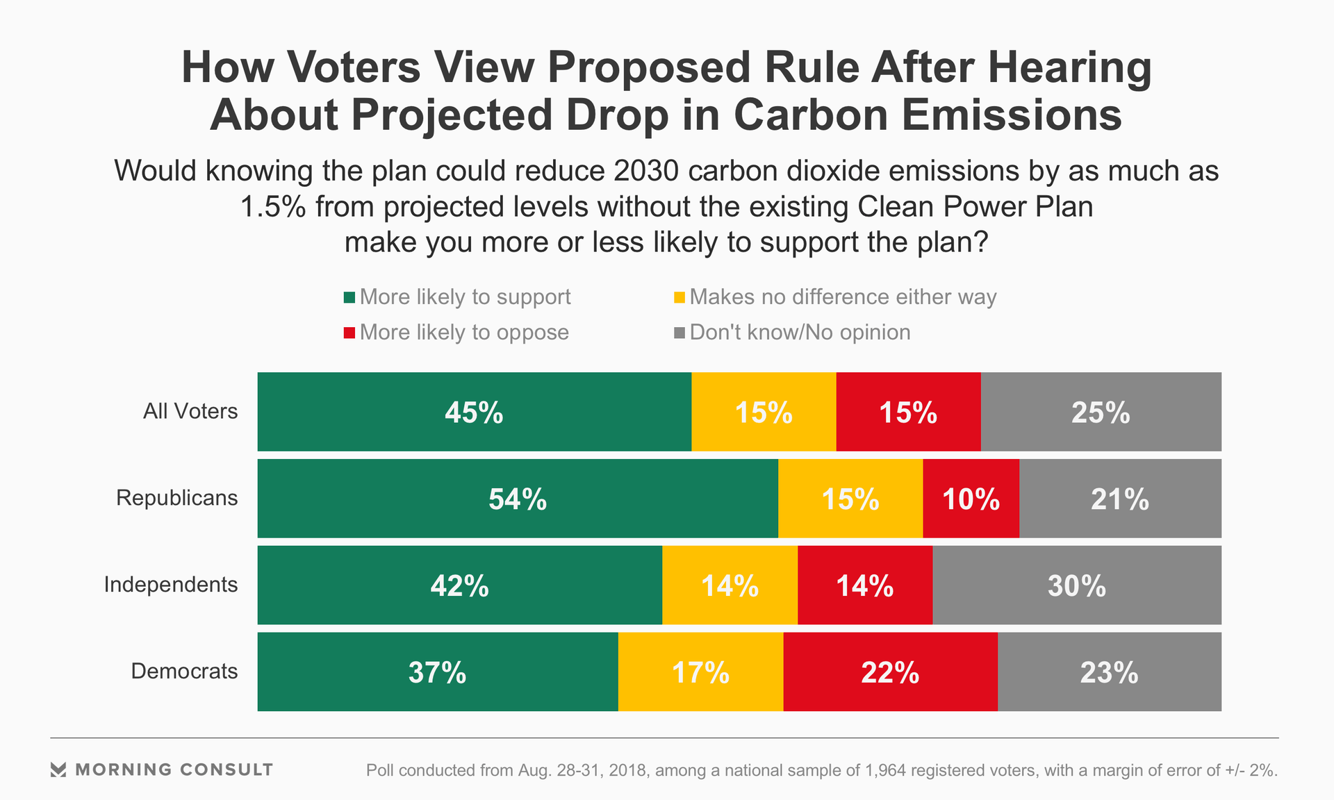 Forty-five percent of voters said they were more likely to back the proposal knowing about the 1.5 percent emissions decrease, while 1 in 4 voters were unsure or had no opinion.