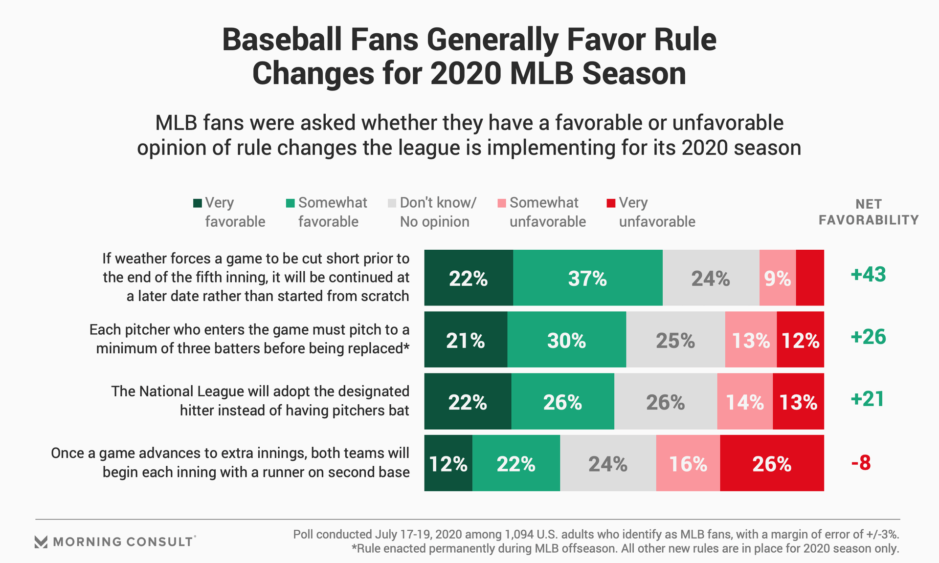 According to a Morning Consult poll conducted ahead of Opening Day, self-identified MLB fans are mostly receptive to three of the four most significant changes to the rules of the game for the 2020 season. Of the four rule changes included in the survey, one was enacted on a permanent basis during the traditional MLB offseason, while the other three are only in place for the pandemic-ridden 2020 season, at least for now.
