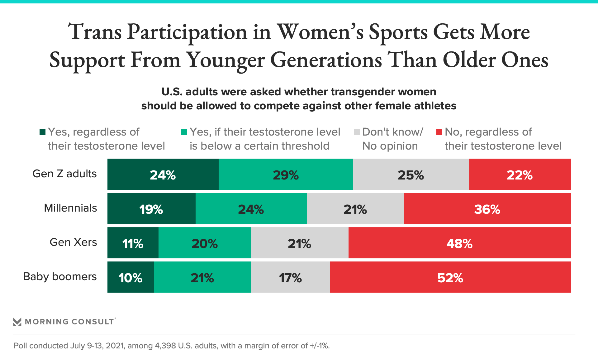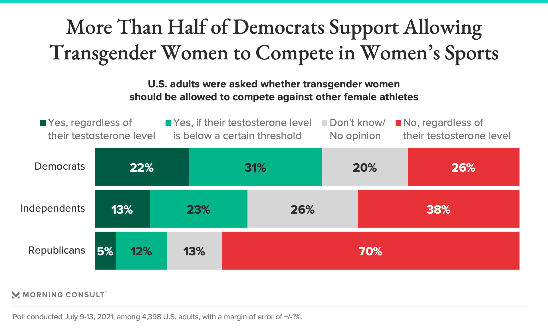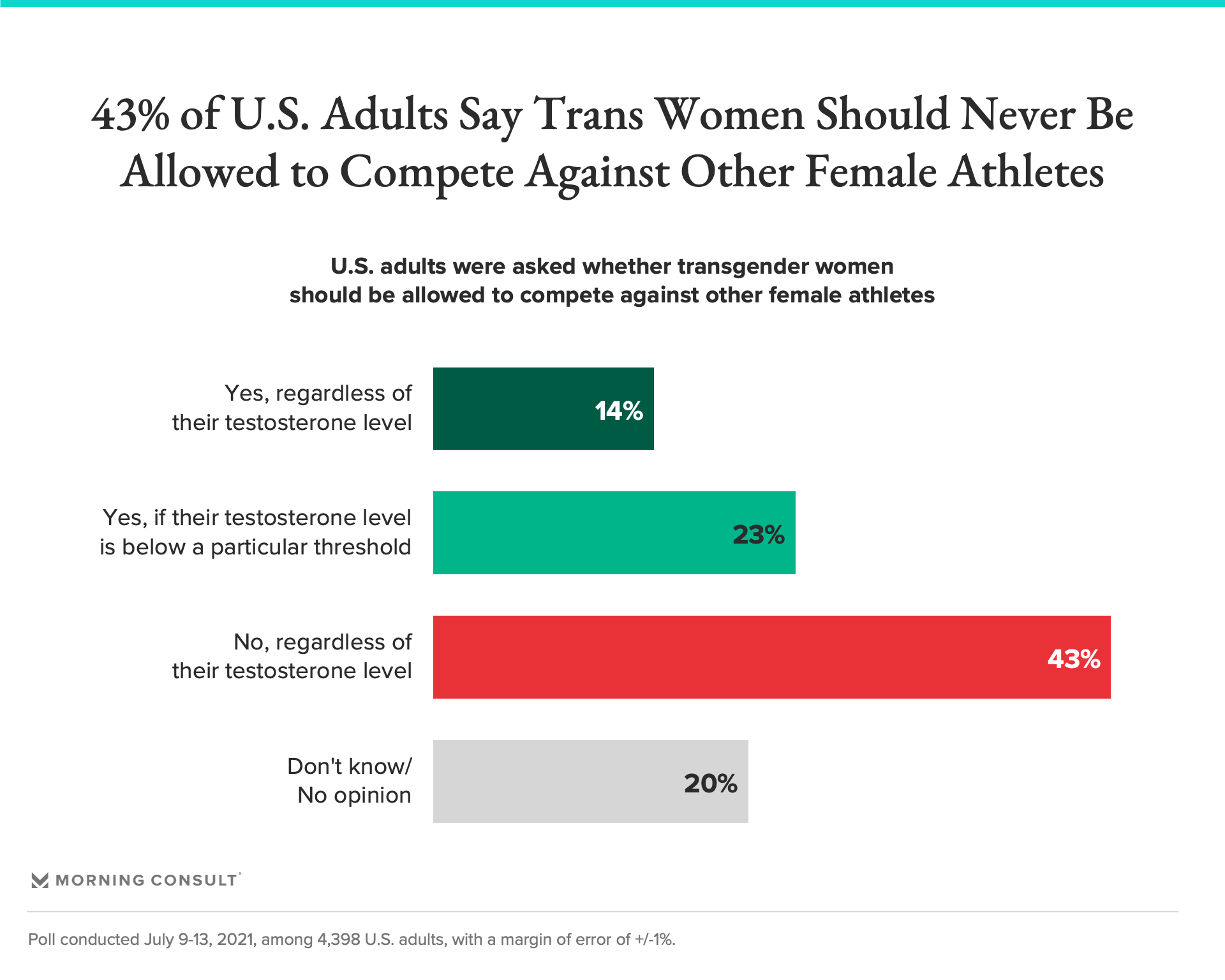 U.S. adults already are more likely to oppose than support the idea of a trans woman playing in women’s sports. In a Morning Consult survey conducted ahead of the Tokyo Olympic Games, 43 percent of U.S. adults said transgender women should not be allowed to compete against other female athletes regardless of their testosterone level, which serves as the primary basis of the International Olympic Committee’s guidelines on whether or not transgender women should be permitted to participate.