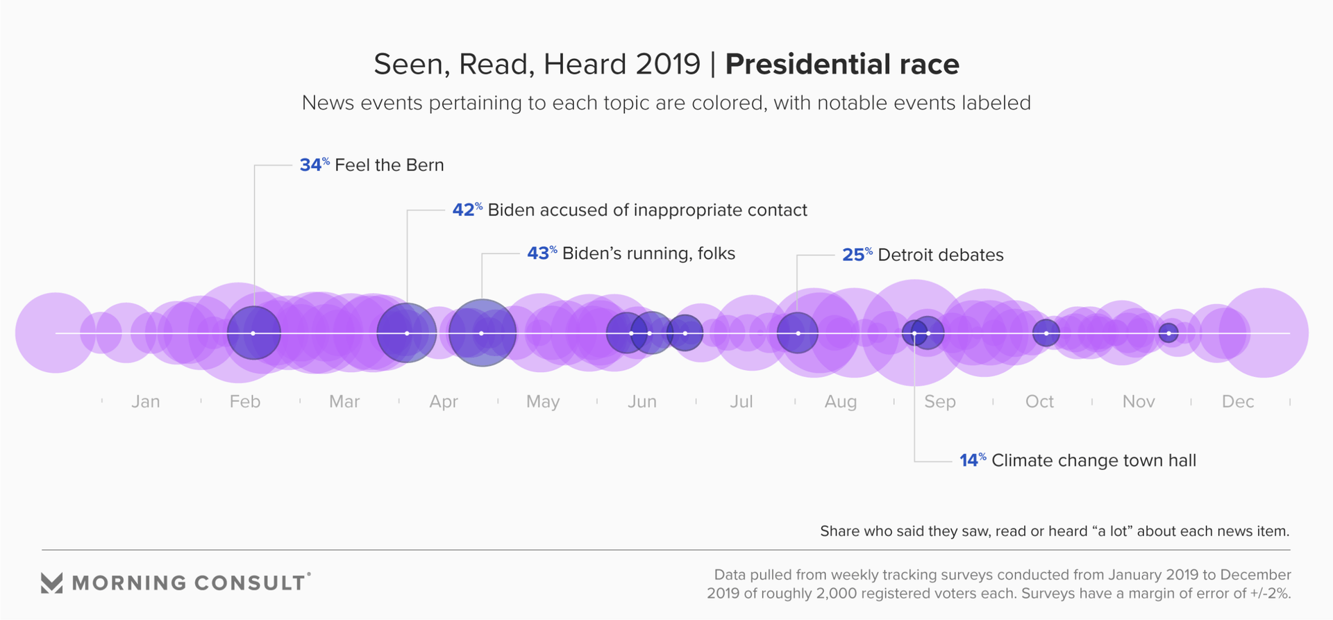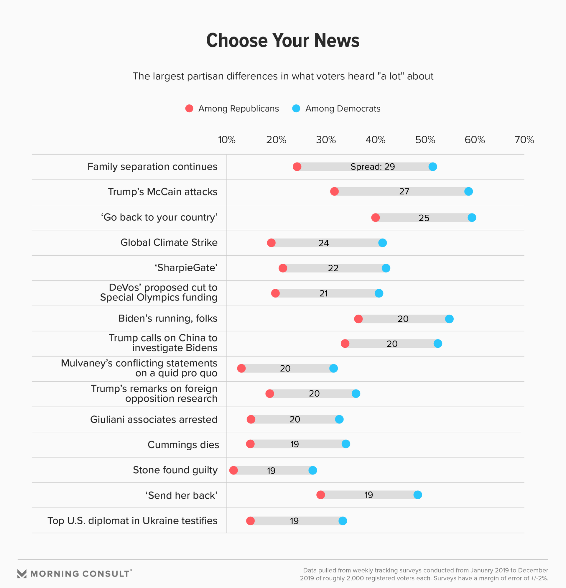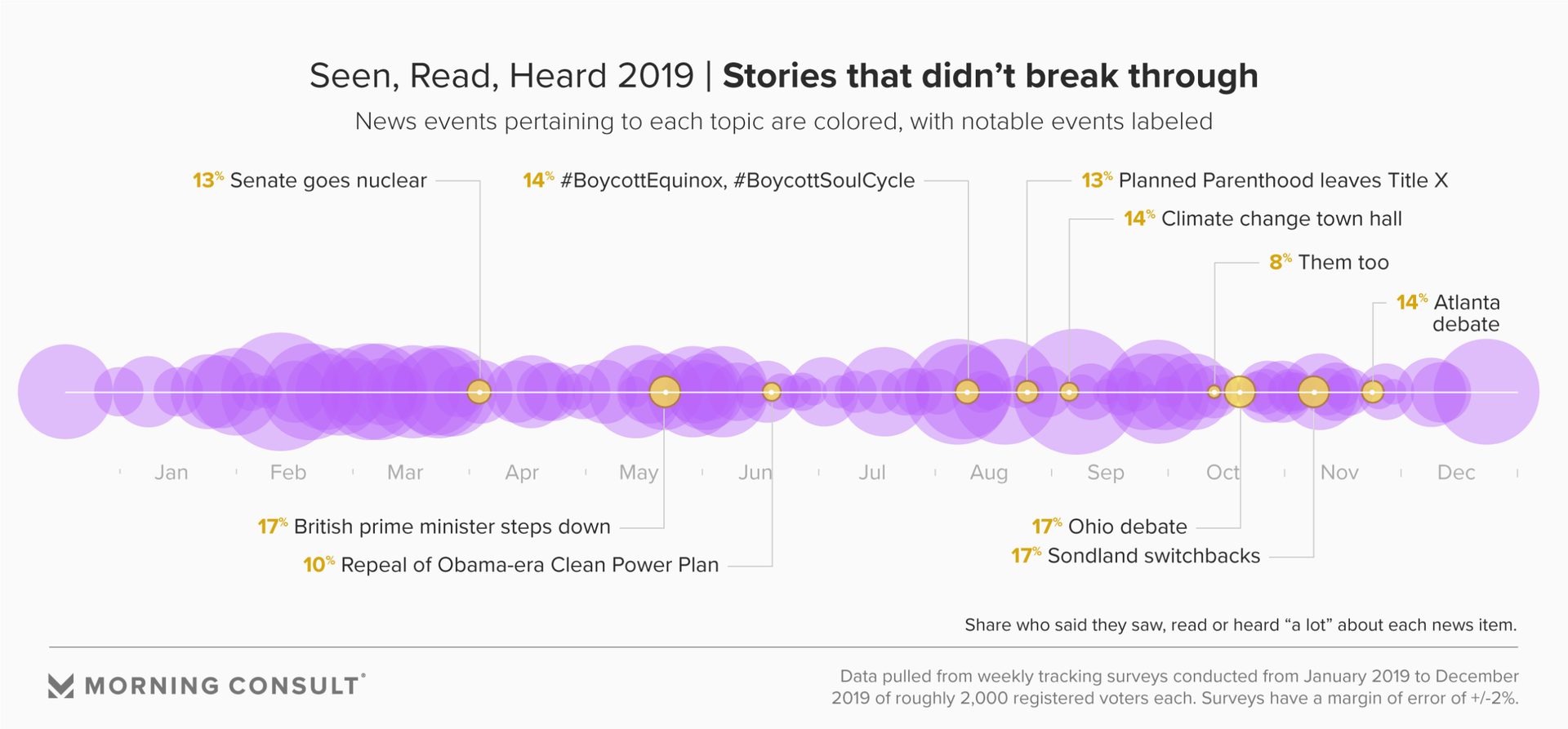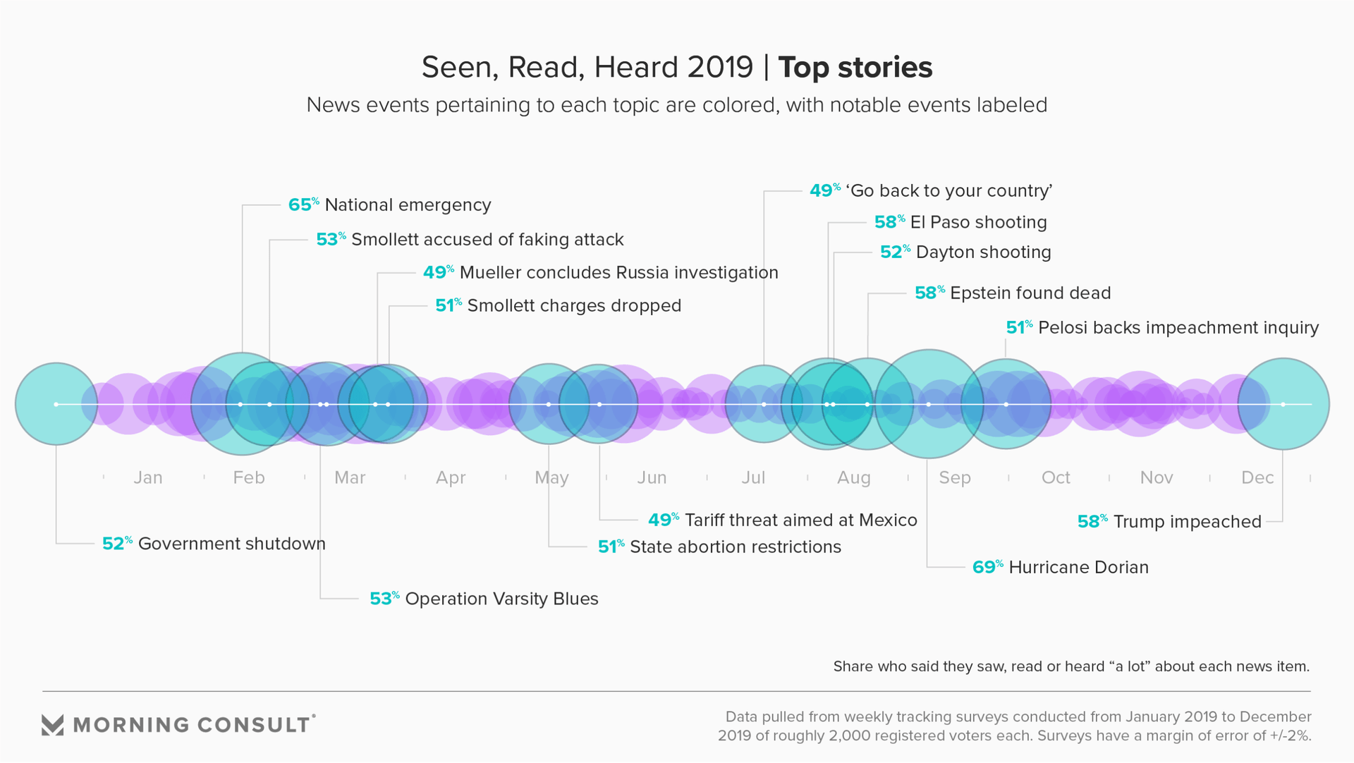 The findings -- based on 47 Morning Consult/Politico polls conducted throughout 2019 that surveyed in total roughly 90,000 registered voters about how much they had seen, read or heard about the top news of the week at the time -- build on last year’s project measuring news penetration.