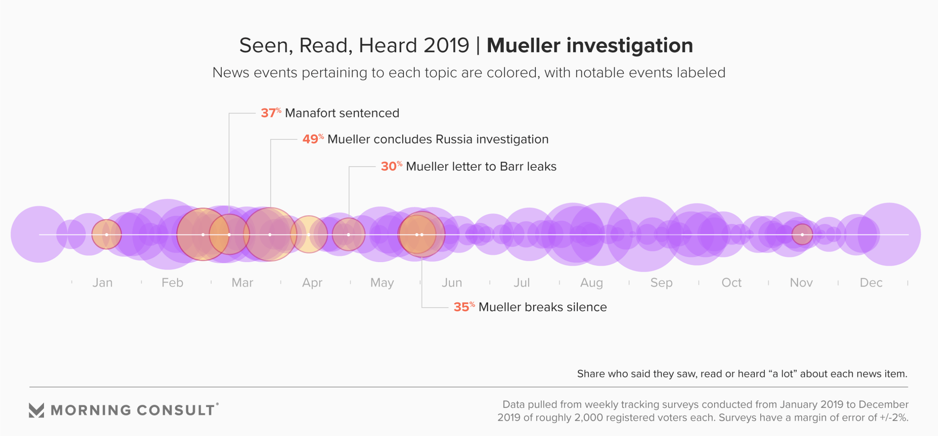 Special counsel Robert Mueller dominated the news cycle early in 2019. The conclusion of his Russia meddling probe was the most widely heard incident among the various news stories about his investigation, with most Republicans (52 percent) and Democrats (54 percent) alike reporting hearing “a lot” about the submission of his report to Attorney General William Barr in late March.