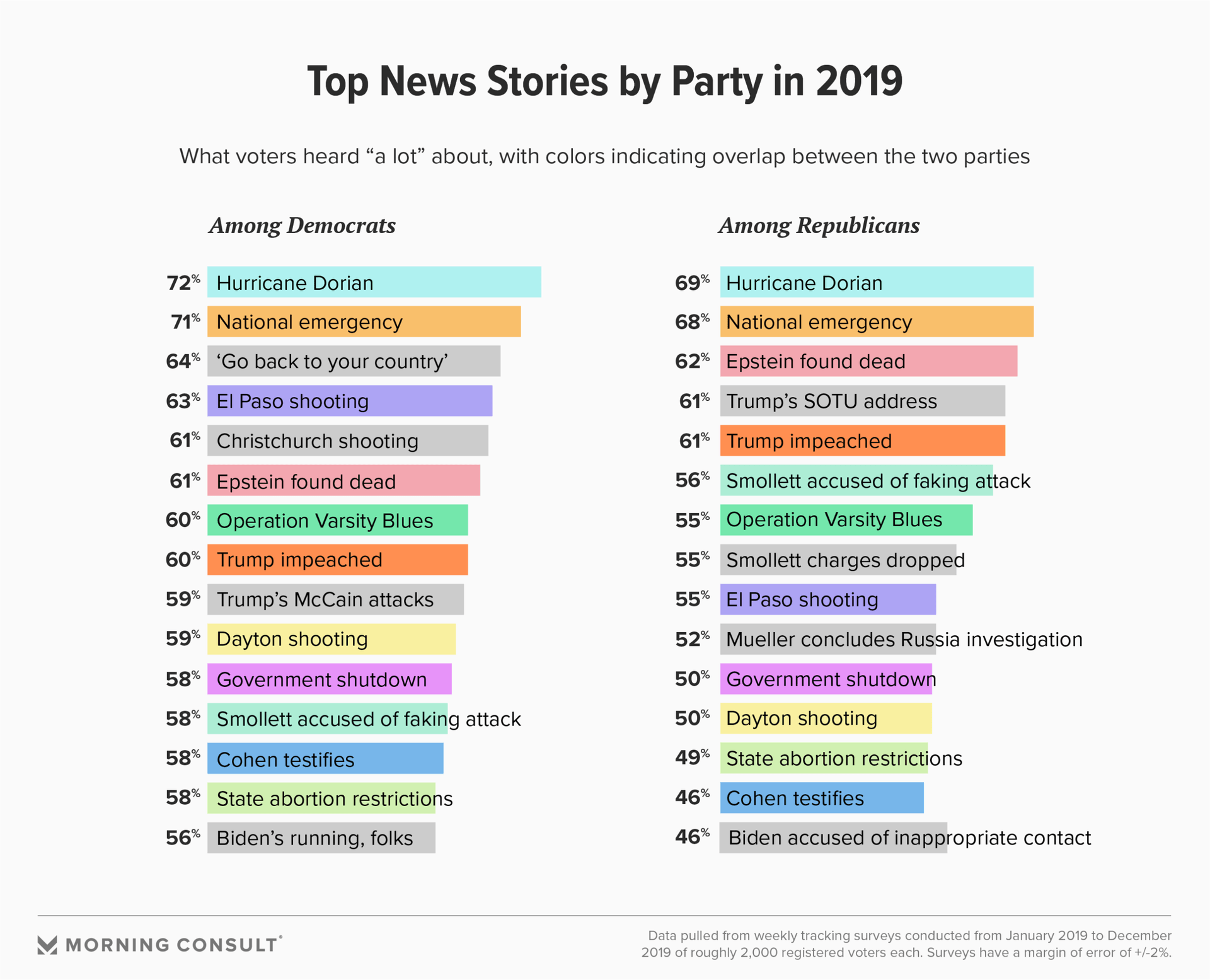 The news with the biggest reach tended to find Democrats and Republicans in roughly equal fashion. Hurricane Dorian topped the list for both parties, as did: Trump’s impeachment; the college admission scandal, dubbed “Operation Varsity Blues,” involving Hollywood actresses, business leaders and other wealthy parents; deadly mass shootings in El Paso, Texas, and Dayton, Ohio; and Georgia and Alabama’s controversial moves to restrict abortion.