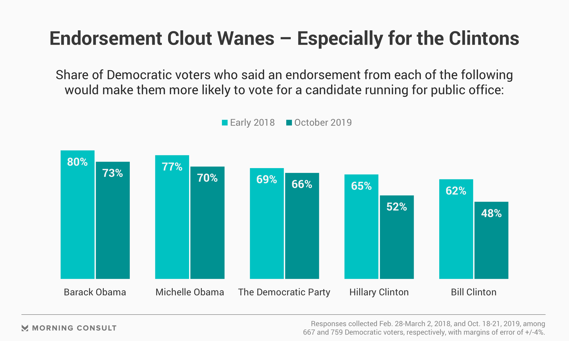 52% of Democrats said they’d be more likely to back a candidate endorsed by Clinton, down 13 points from early 2018.
