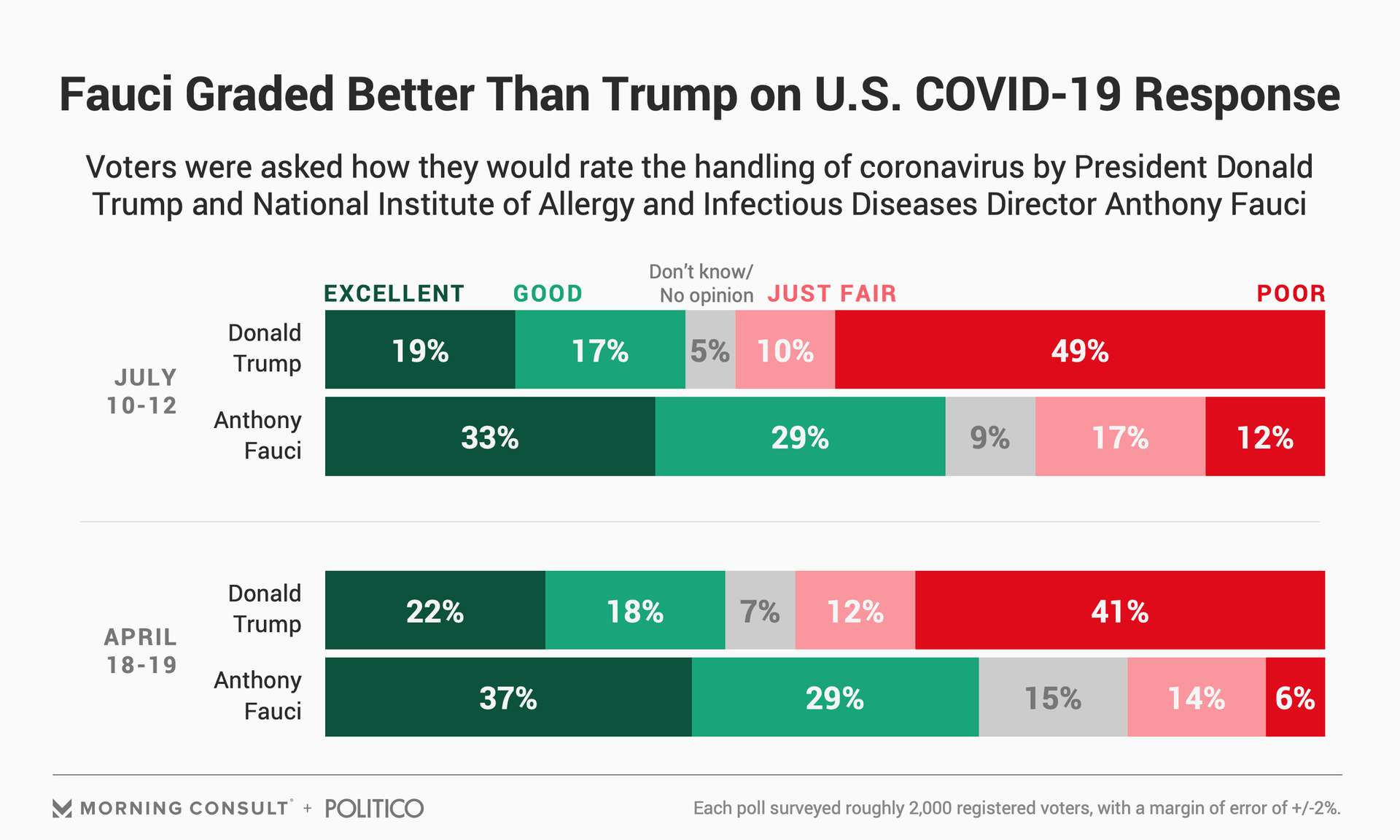According to a new Morning Consult/Politico poll, 62 percent of voters rated Fauci’s handling of the coronavirus “excellent” or “good,” compared with 36 percent who rated Trump similarly. Positive figures for both men fell slightly since a poll conducted in mid-April, as more voters formed opinions and larger shares rated their handling as “poor.”