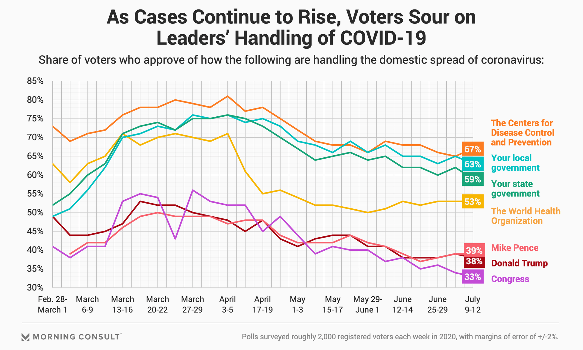 Only Congress received worse evaluations, with 33 percent of voters approving of their handling of the COVID-19 spread, while roughly 3 in 5 have positive views of the responses of the Centers of Disease Control and Prevention or their state and local governments.