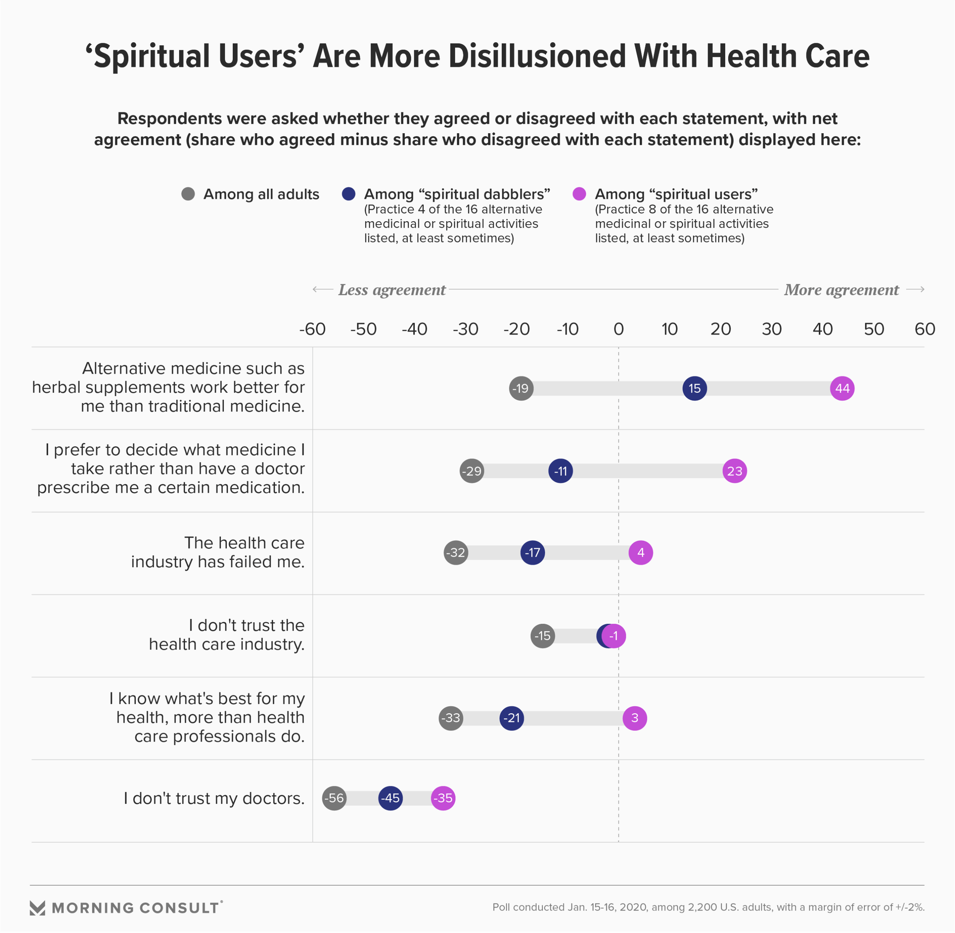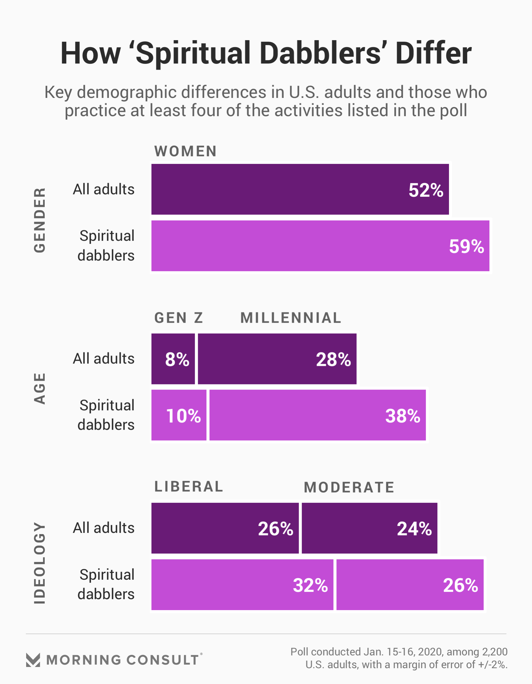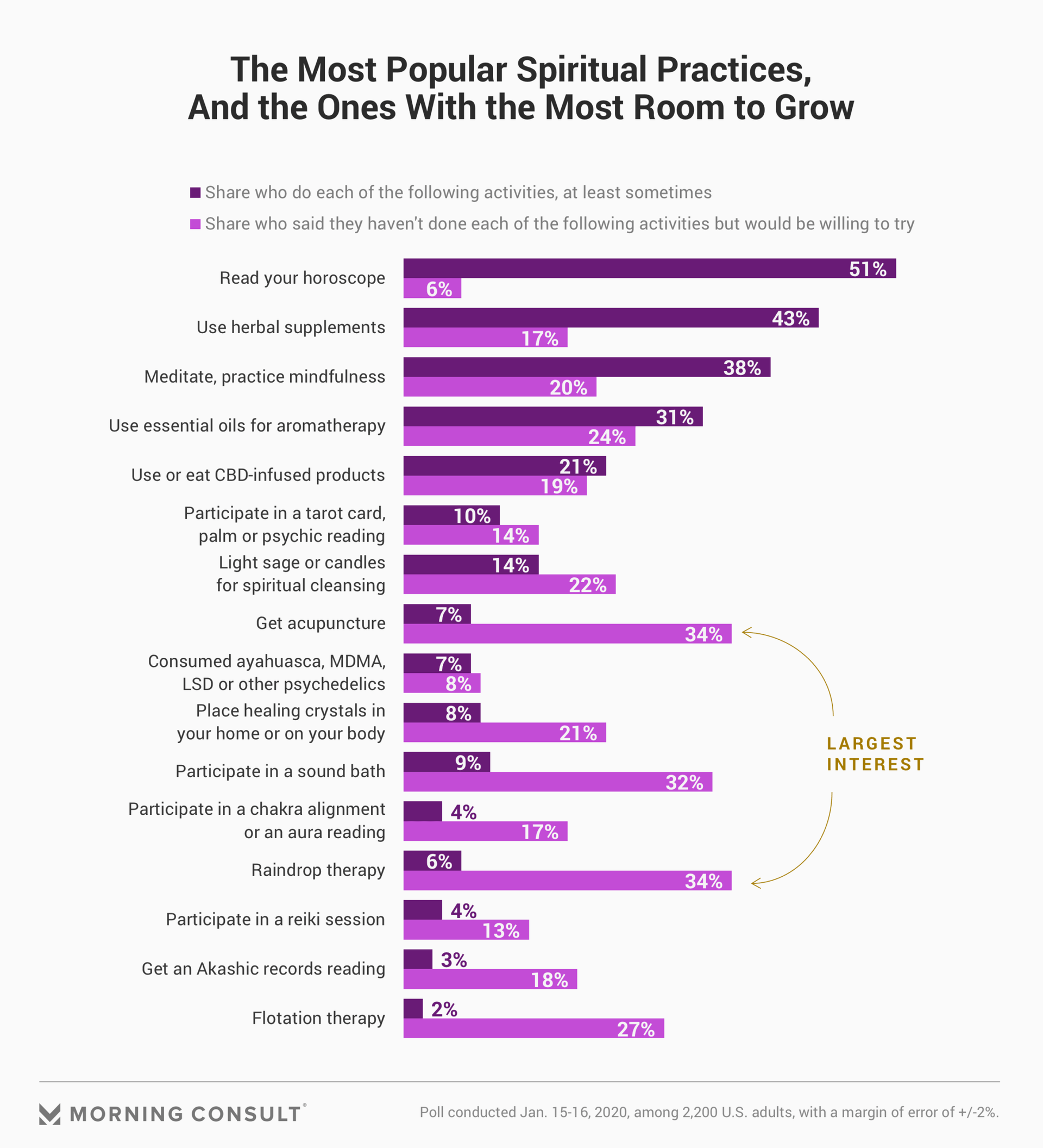 Only 6 percent of the public had tried at least half of the activities listed; Morning Consult dubs them “spiritual users.” The survey was conducted Jan. 15-16, 2020 among 2,200 U.S. adults with a margin of error of 2 percentage points.