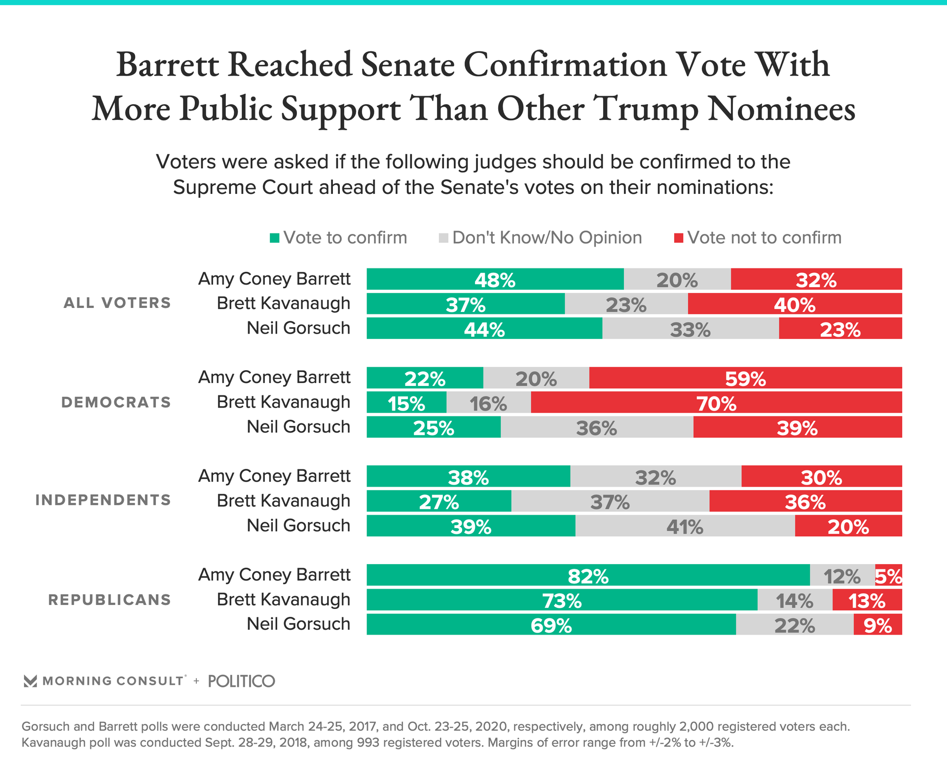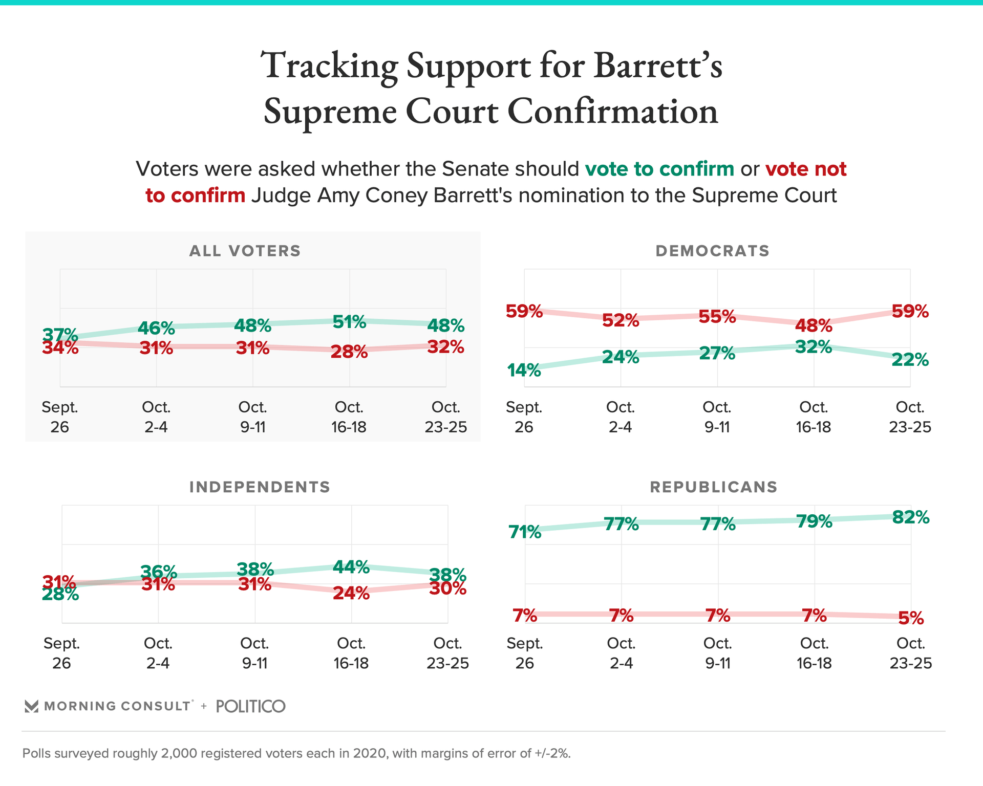 According to a new Morning Consult/Politico poll, conducted Oct. 23-25 among 1,990 registered voters, 48 percent said the Senate should vote to confirm Barrett, down from a 51 percent high in a survey conducted after her confirmation hearings. About a third of voters (32 percent) said the Senate should vote down her nomination, up 4 percentage points from the previous week. The poll has a margin of error of 2 points.