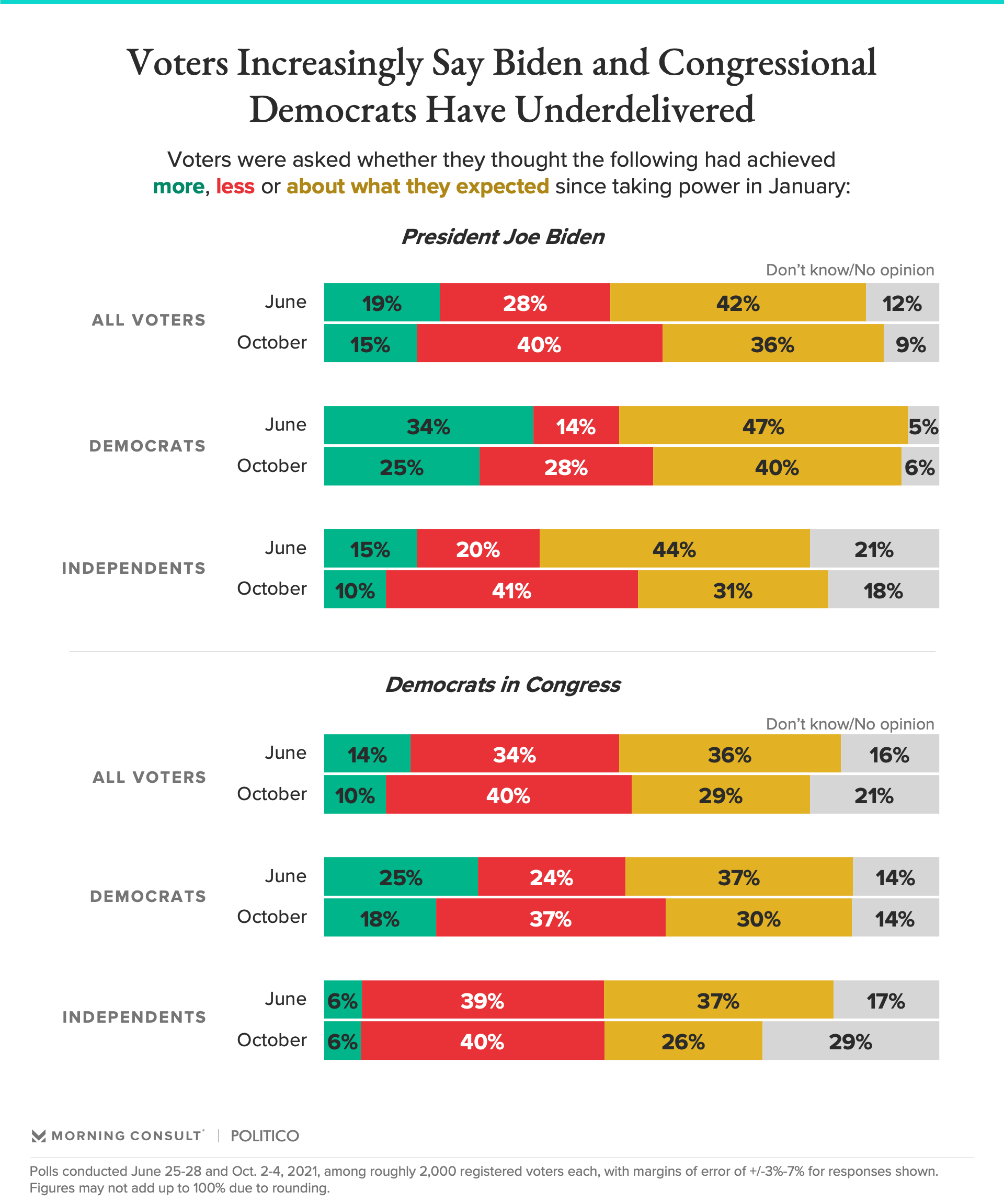 In the Oct. 2-4 poll, 41 percent of independent voters and 28 percent of Democratic voters said Biden has accomplished less than they’d expected, both double the share who said the same in June. The base outlook is even worse for Democrats in Congress: Democratic voters are now more likely to say their party’s lawmakers are underperforming expectations than overperforming or meeting benchmarks.