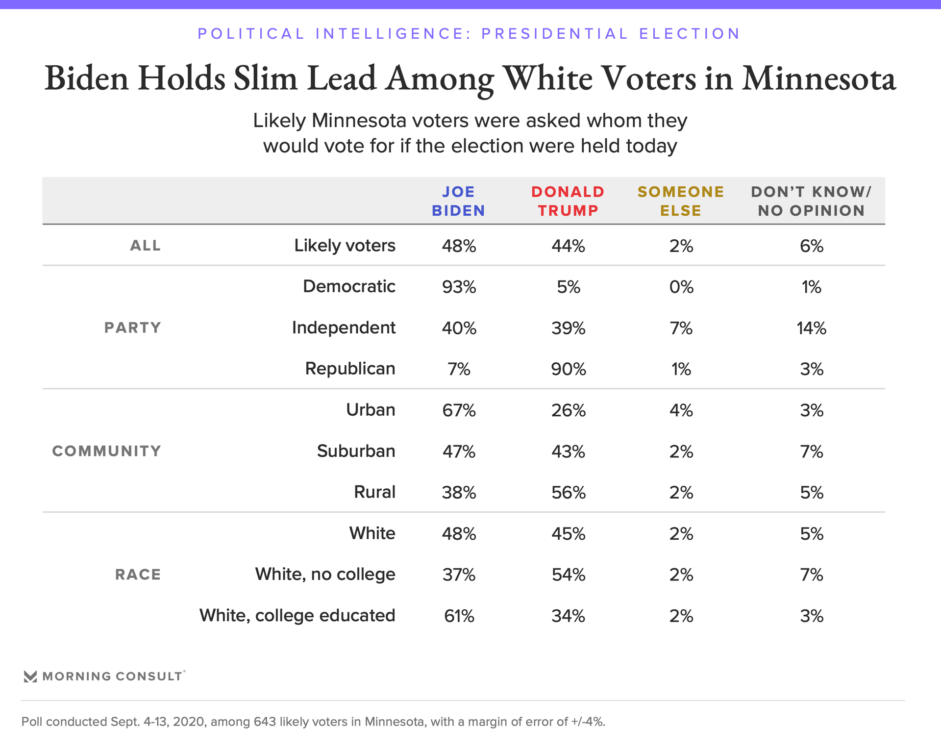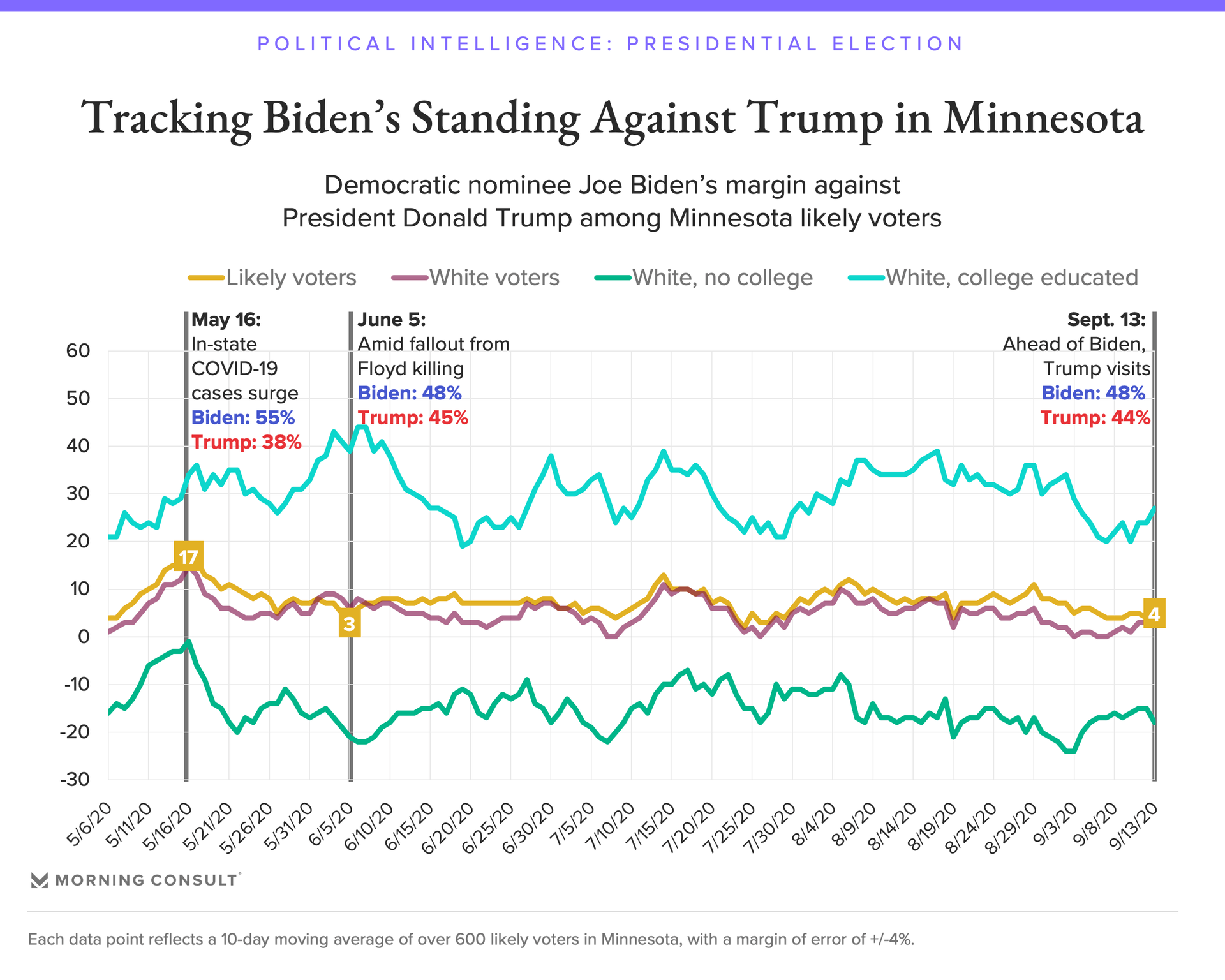 Biden leads Trump by 4 percentage points, 48 percent to 44 percent, in the latest Morning Consult Political Intelligence tracking of the Gopher State conducted Sept. 4-13 among 643 likely voters, inside the poll’s 4-point margin of error.