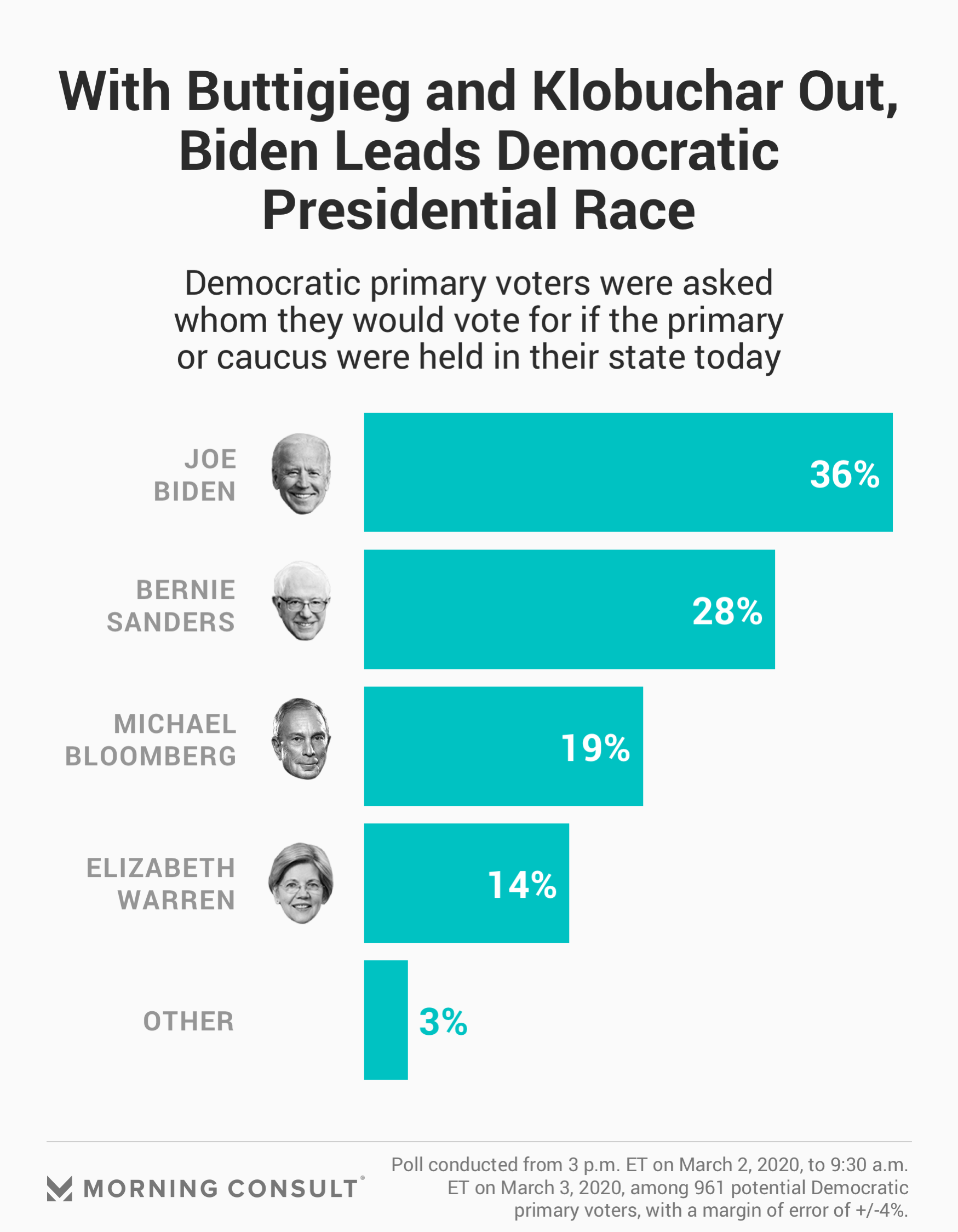 Biden Reclaims National Lead With Buttigieg, Klobuchar Exits