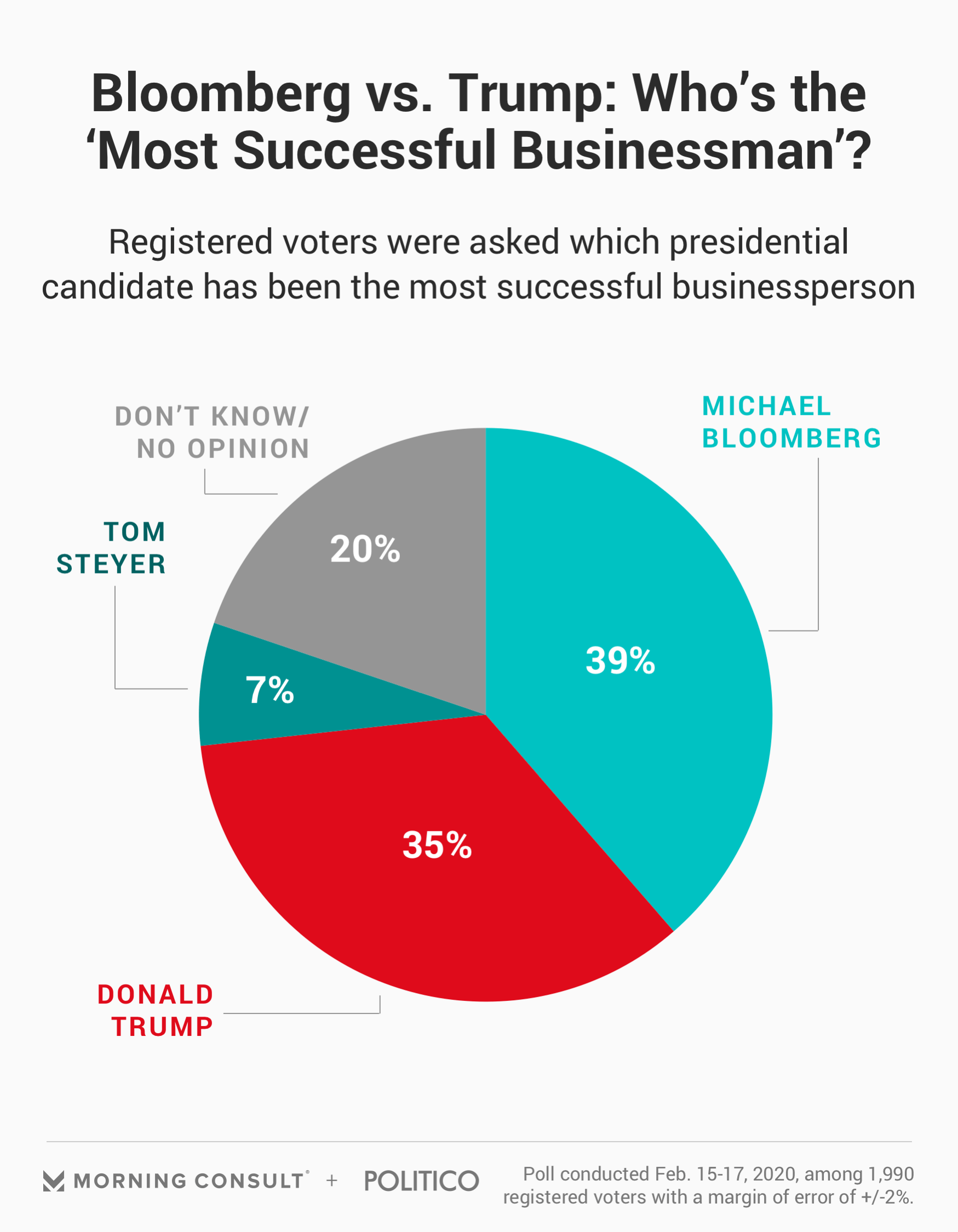 Democratic presidential candidate Michael Bloomberg has made calling President Donald Trump a failed businessman a central part of his campaigning. Now, in an election that is shaping up as a potential billionaire-versus-billionaire battle, new polling from Morning Consult/Politico shows which businessman voters have deemed most successful.
