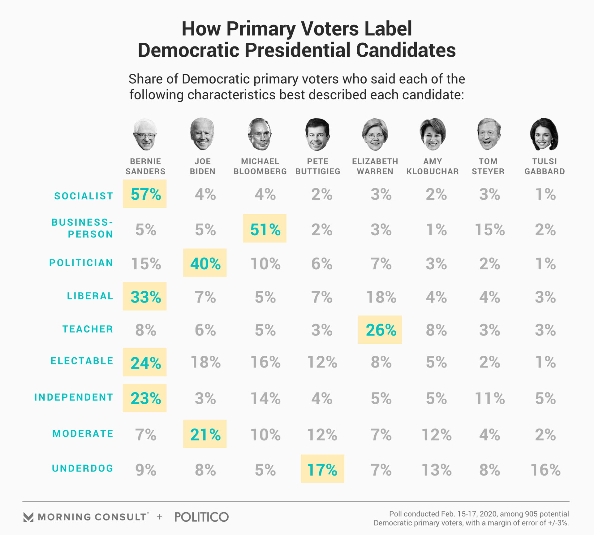 “Most successful businessperson” is not the only label on which the survey asked respondents to weigh in. Potential Democratic primary voters were asked which terms, such as “socialist,” “underdog” and “teacher,” best suited each of the Democratic hopefuls.