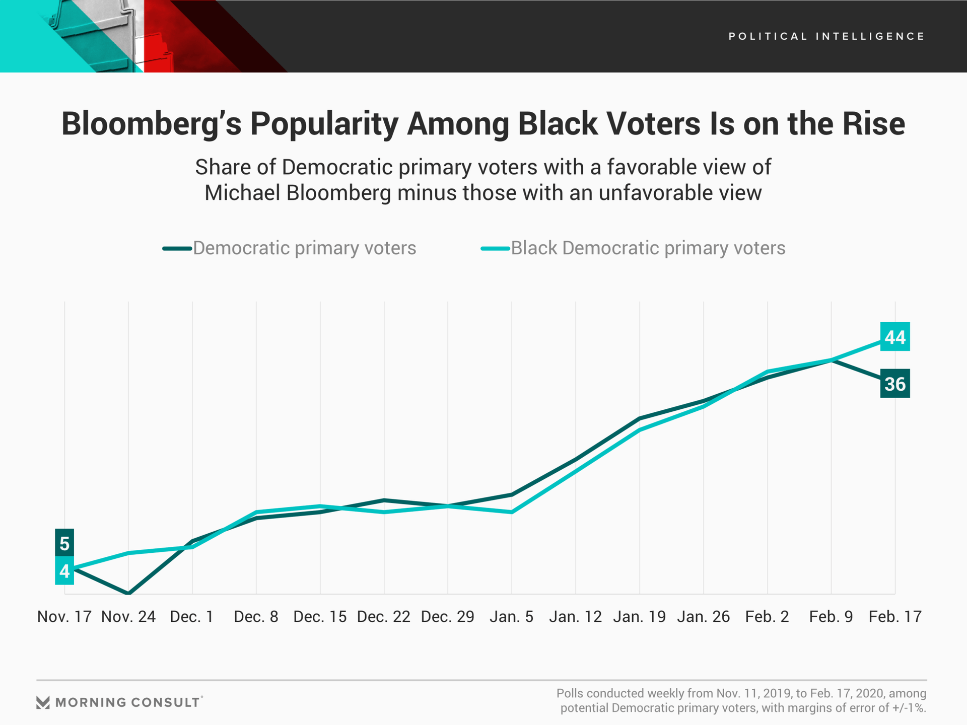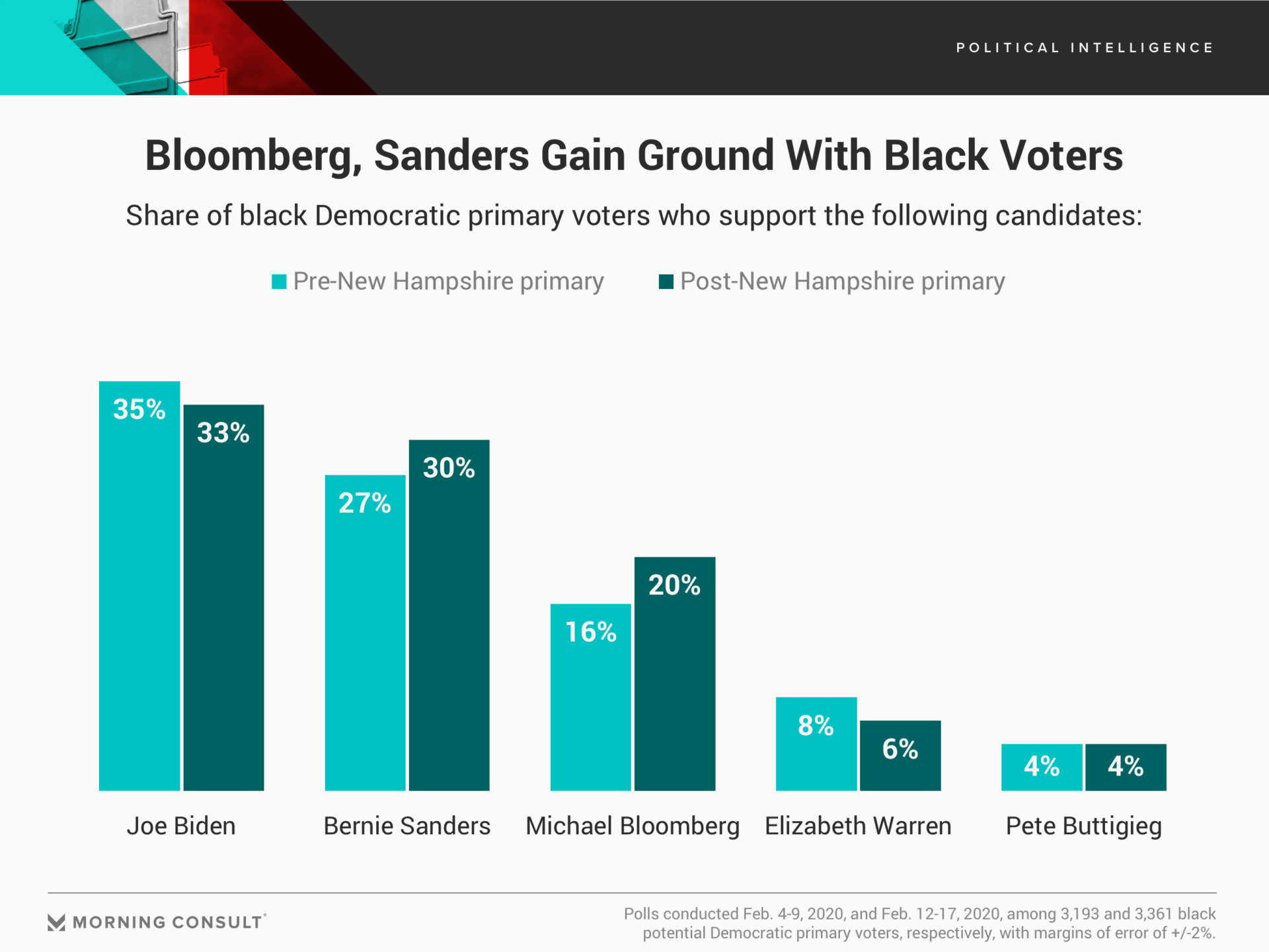 New Morning Consult polling tracking the race for the Democratic nomination found Bloomberg is the first choice for 20 percent of black voters who indicated they may vote in the primary or caucus in their state, up 4 percentage points since polls conducted before the Feb. 11 New Hampshire primary.