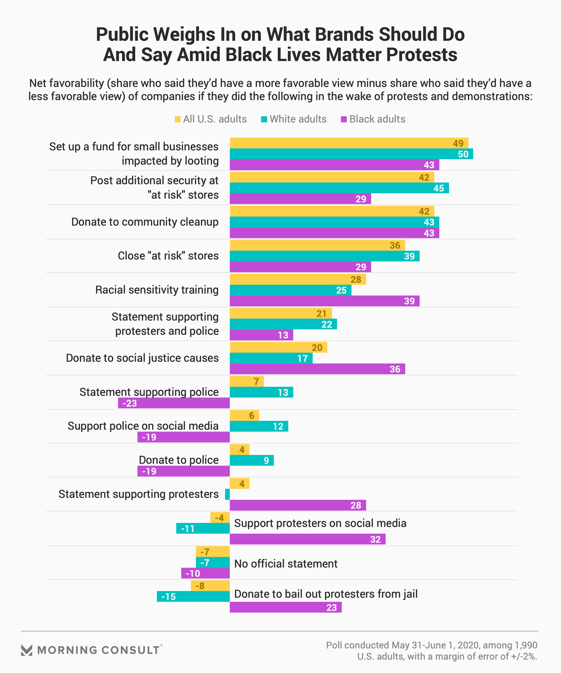 Fifty-one percent of all U.S. adults said they would have a more positive view of a company that adds additional security measures for “at risk” stores, while 46 percent said they would appreciate brands that close those stores completely. Those two measures are more popular among white Americans than black Americans.