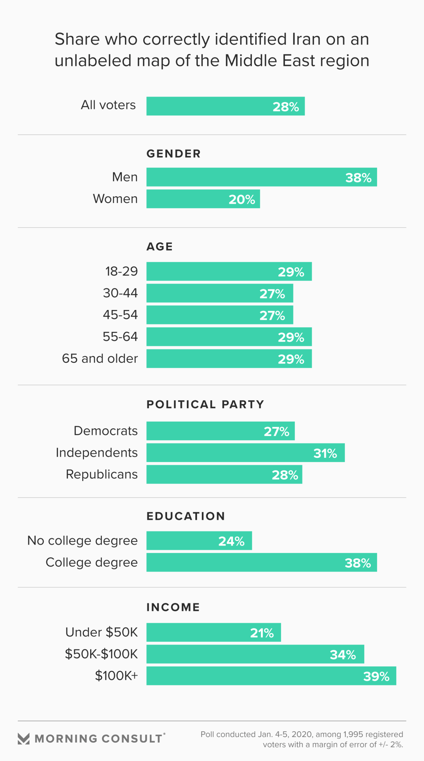 Men were about twice as likely as women to be able to identify Iran on both maps, roughly reflecting what a 2017 Morning Consult experiment involving North Korea found. Wealthier and more educated voters were also more likely to get it right, while political party and age were not powerful factors.